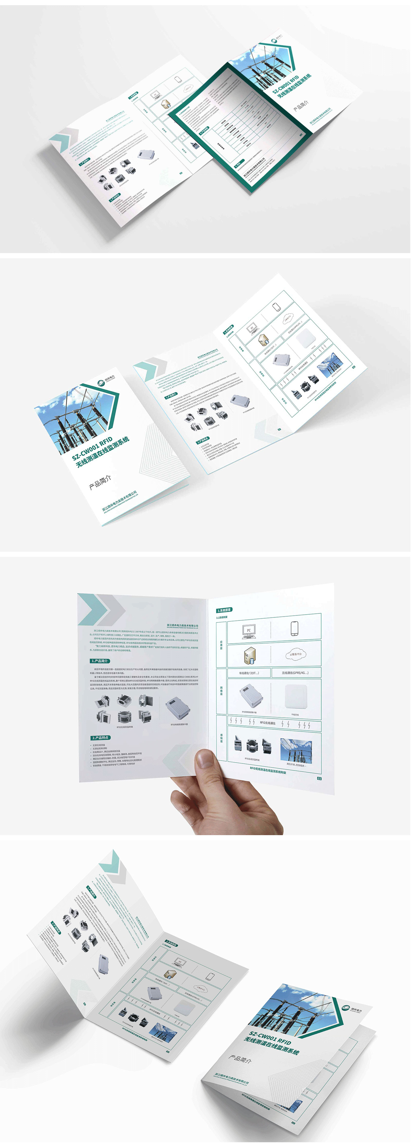 手提袋具有流動性強、宣傳性強等優點,對企業品牌形象的宣傳有一定的促進作用。基于此,石特對此次的設計任務提出了新的想法:手提袋在設計時,其主畫面以公司的logo與企業名稱為主,logo以漸變色的線條構成,畫面干凈簡潔,在加深受眾對公司印象的同時也有利于獲得更好的宣傳效果;在色彩選擇上,選取淡綠色為主色調,與企業的標準色保持一致,宣傳更具統一性。此外,石特還對順舟電力產品折頁進行了設計,獲得了客戶的認可。