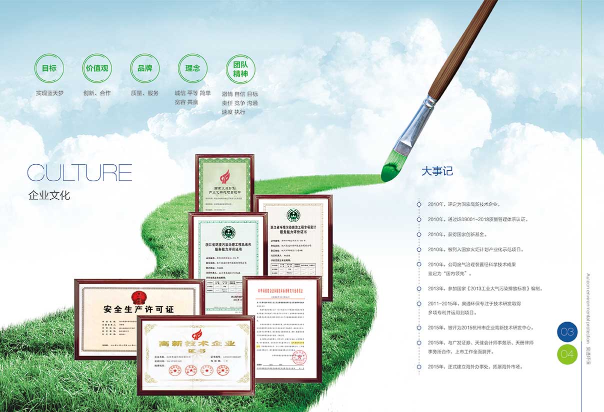 奧通環保作為工業廢氣治理專家,為工業企業提供廢氣治理 全面解決方案,為企業提供量身定制的廢氣治理裝置。公司具有雄厚的技術實力,現有員工50余人,其中大專以上學歷45人,研發人員24人,擁有環境污染防 治工程專項設計甲級資質、總承包甲級資質、環保工程專業承包三級資質及安全生產資質,完整的安全體系、設計體系、采購及監造體系及完善的質量管理和項目管 理制度,以驅散中國霧霾噩夢,實現藍天夢為目標,努力成長為工業廢氣治理行業市場占有率第一,技術集成能力第一的綠色環保企業。