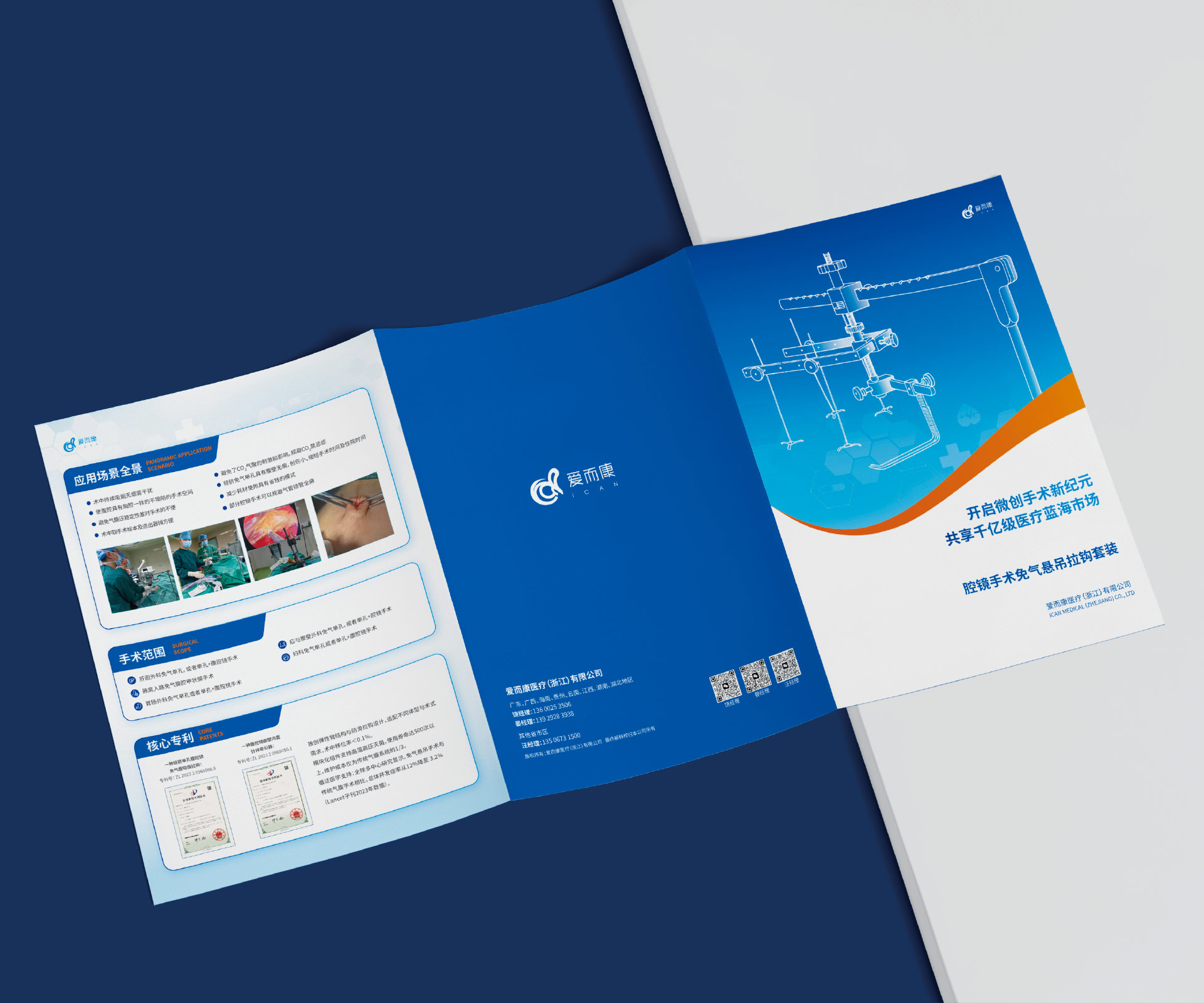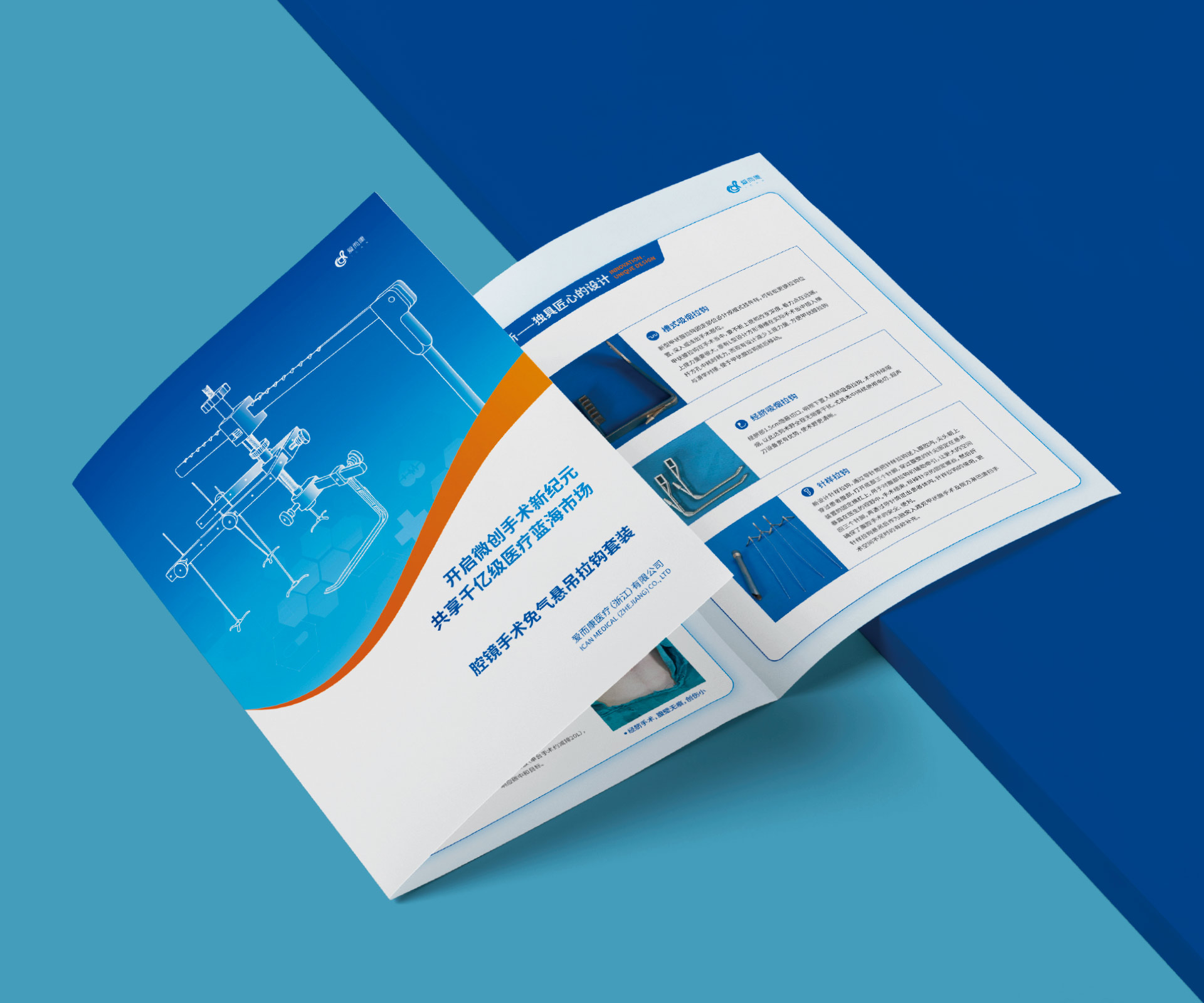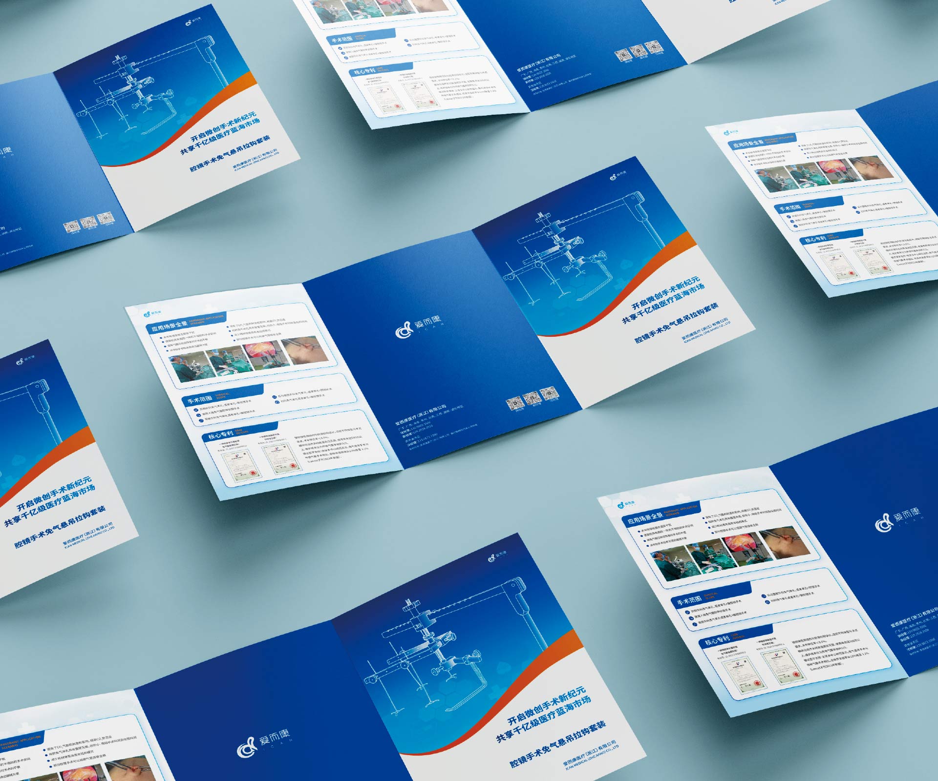 本項目是石特大健康為愛而康醫療(浙江)有限公司的創新產品——腔鏡手術免氣懸吊拉鉤套裝策劃設計的三折頁宣傳物料。該產品通過顛覆性的“免氣腹”懸吊技術,為腔鏡手術提供了全新的解決方案。我們的核心挑戰在于,如何在這一份小巧的三折頁中,向時間寶貴的外科醫生清晰、直觀地闡釋這一相對陌生的技術原理,并將其與傳統氣腹手術的對比優勢(如避免相關并發癥、提升手術安全性等)進行強有力的傳達,從而引發他們的興趣與嘗試意愿。