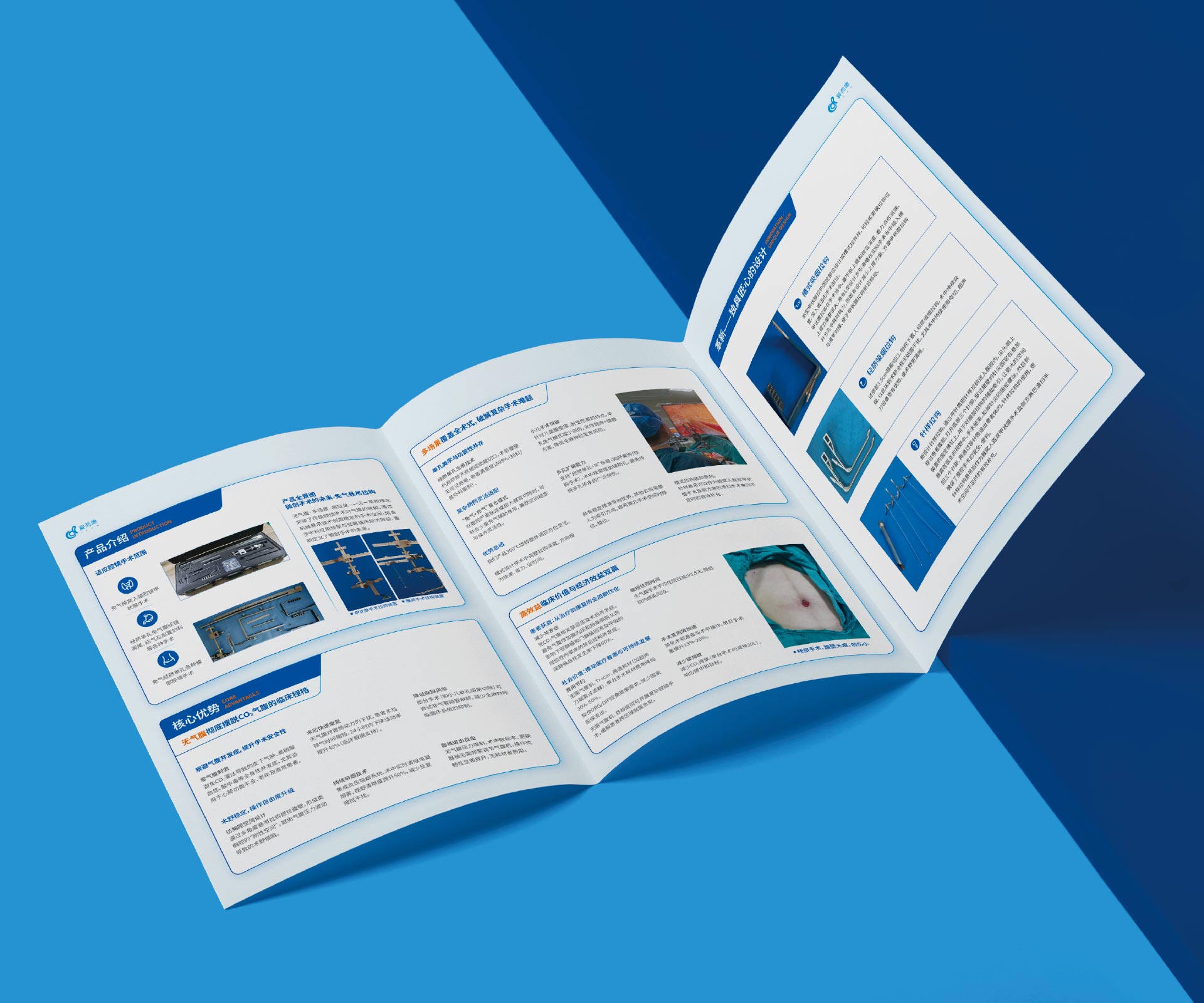• 專業嚴謹的視覺調性: 采用手術室場景中常見的藍、綠色系,搭配專業的醫療器械攝影和科學圖示,營造出嚴謹、可靠的專業氛圍。