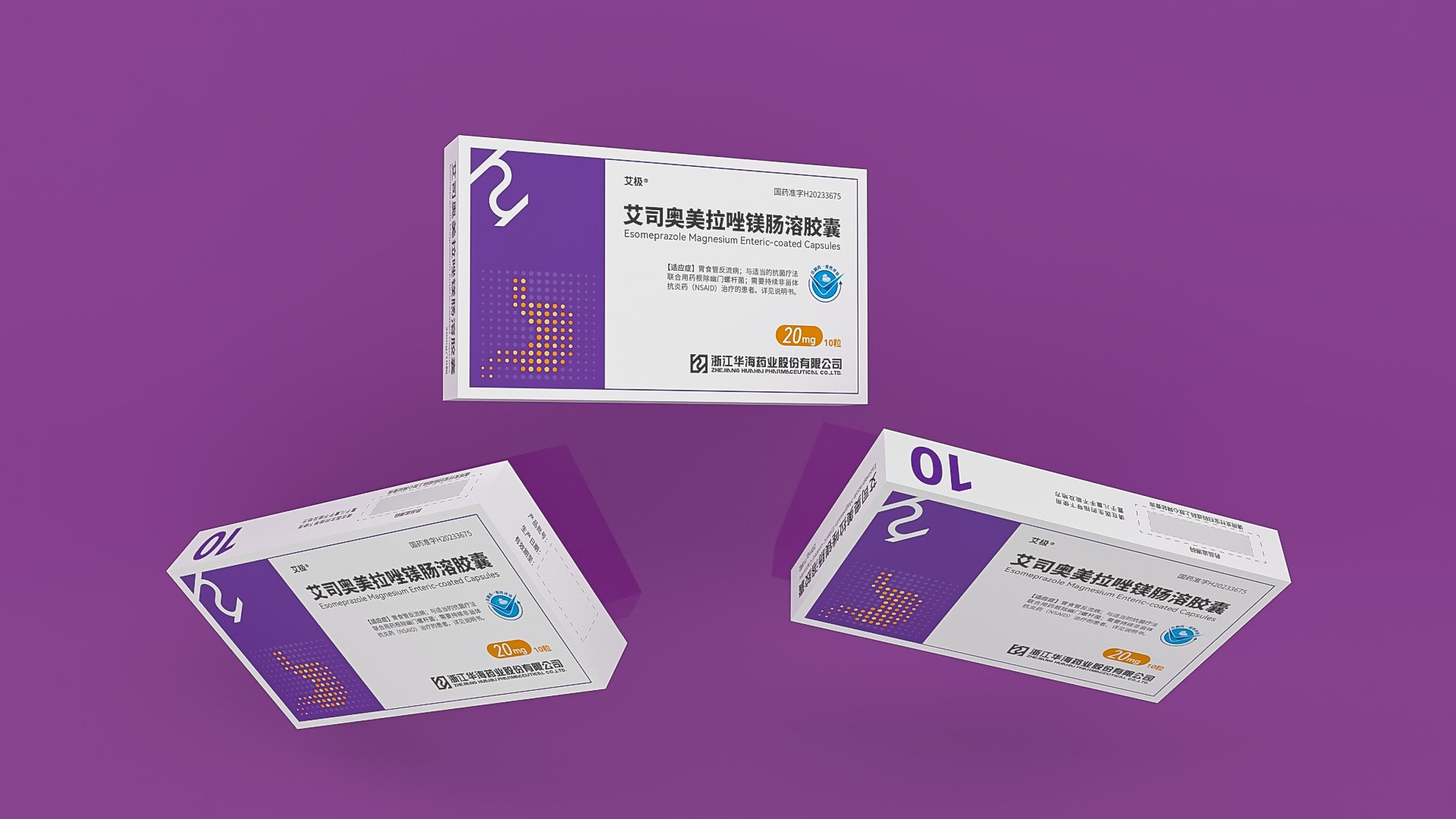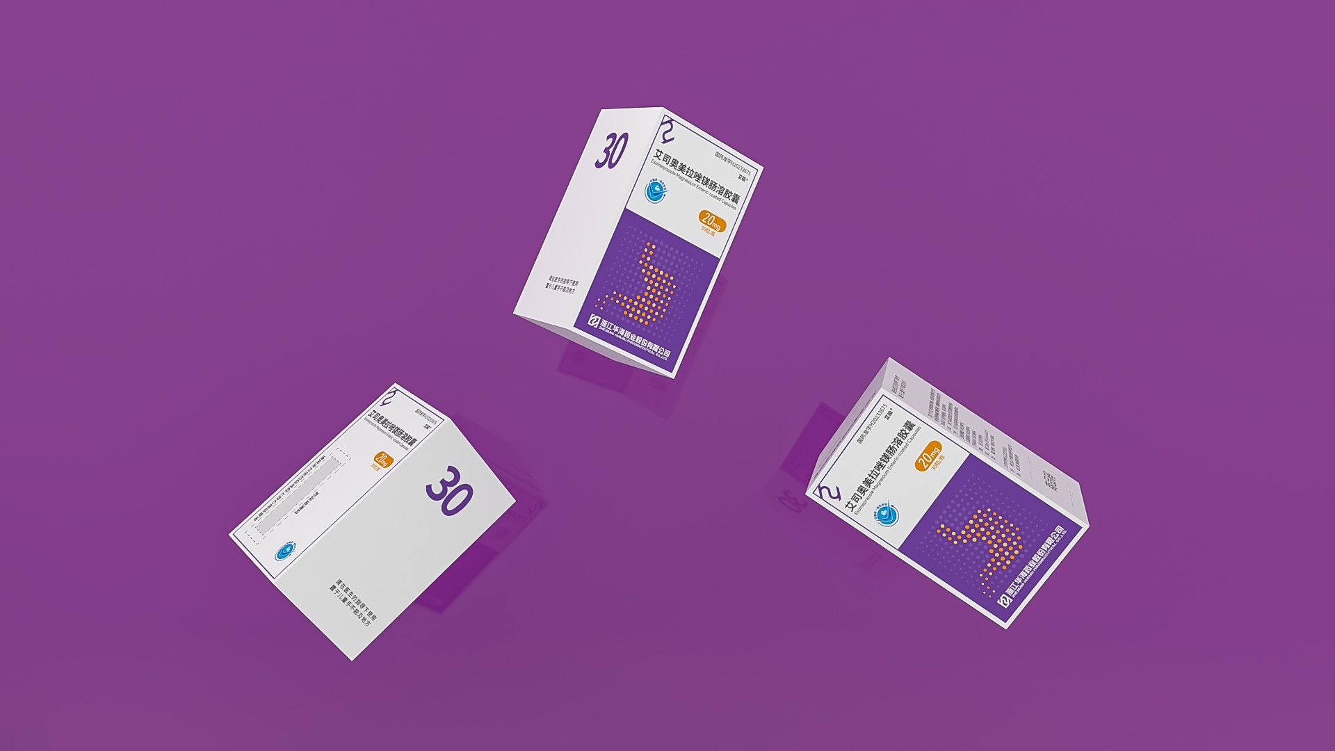 艾司奧美拉唑鎂腸溶膠囊的包裝設計靈感來源于其獨特的醫療價值和品牌理念。白色背景象征著產品的純凈與高效,同時也體現了品牌的信賴與專業。紫色的字體和圖案則增添了一抹神秘和高貴的色彩,進一步強調了產品的獨特性和高端品質。