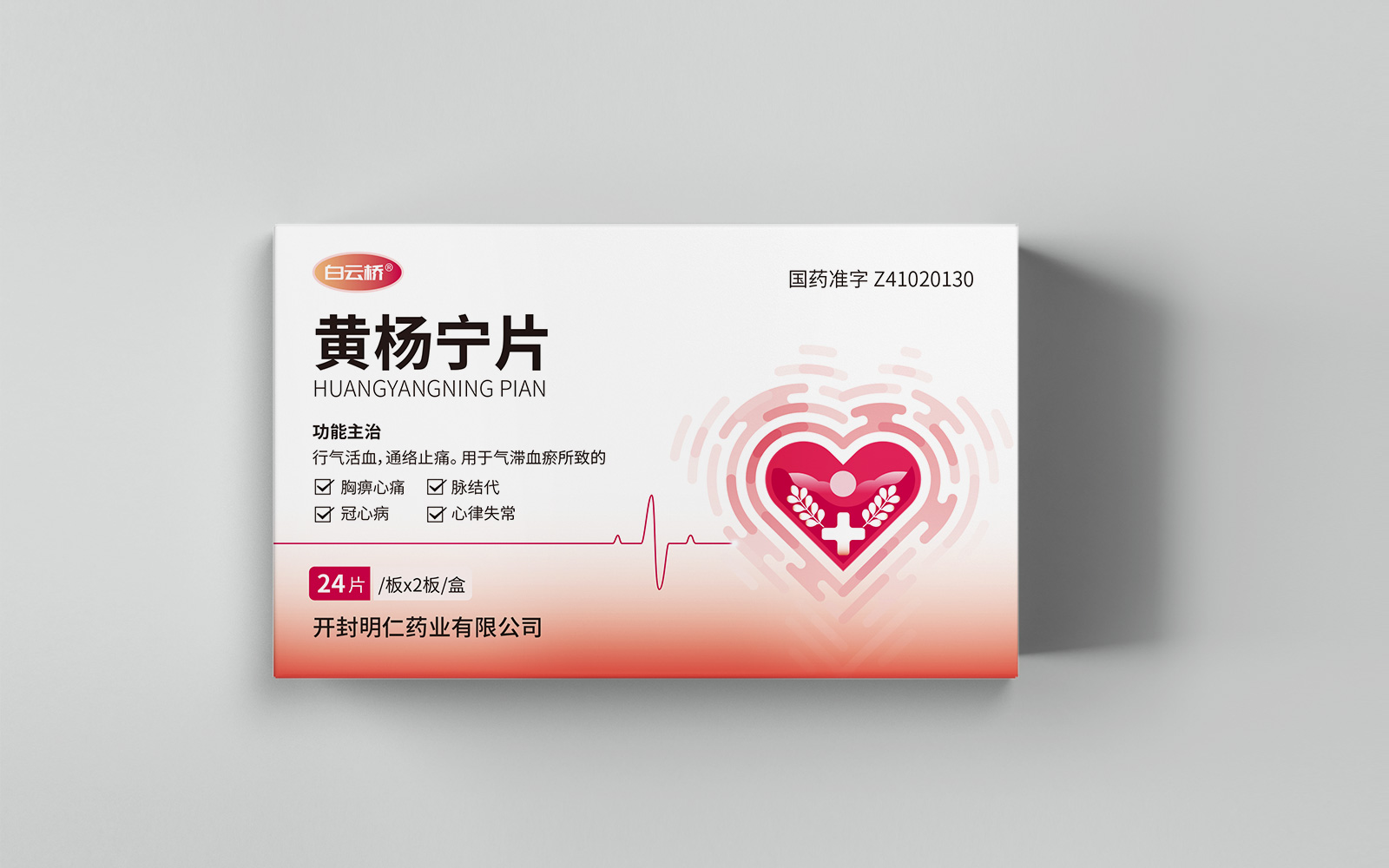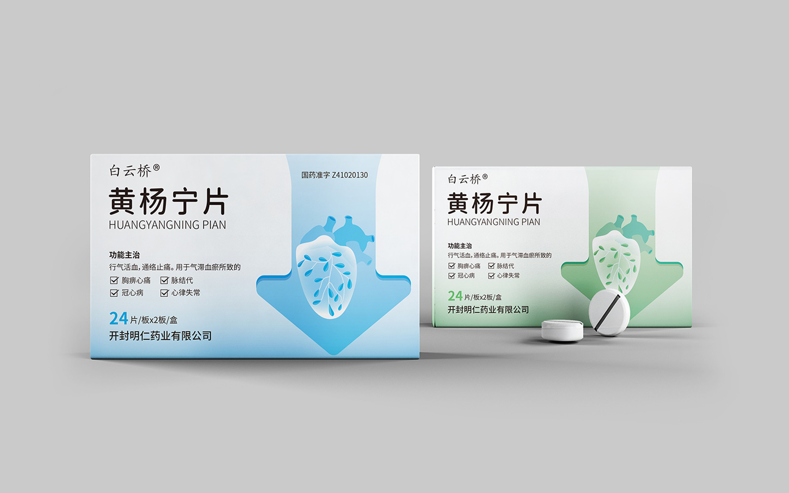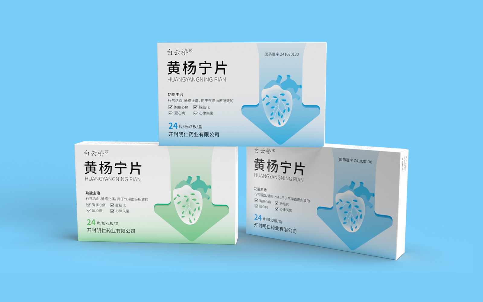 整體畫面以藍色為主,具有涼爽、安靜舒適感覺。藍色有利于病人克制沖動和煩躁,能夠平緩安撫病人的心情。箭頭,體現藥品快速、持久、作用精準,迅速緩解心絞痛等癥狀同時形成獨特圖形符號,符號簡潔,識別度高。心臟圖案,與藥品作用屬性符合加強對藥品的認知與記憶。黃楊葉片與心臟血管相結合,體現純中藥植物提取作用于心腦血管療效。同時結合脈絡線條設計凸顯藥品活血通絡的藥理,便于消費者認知。