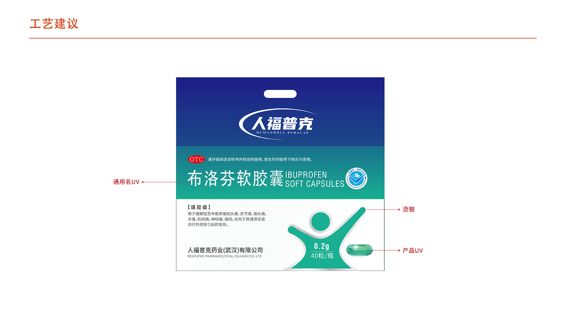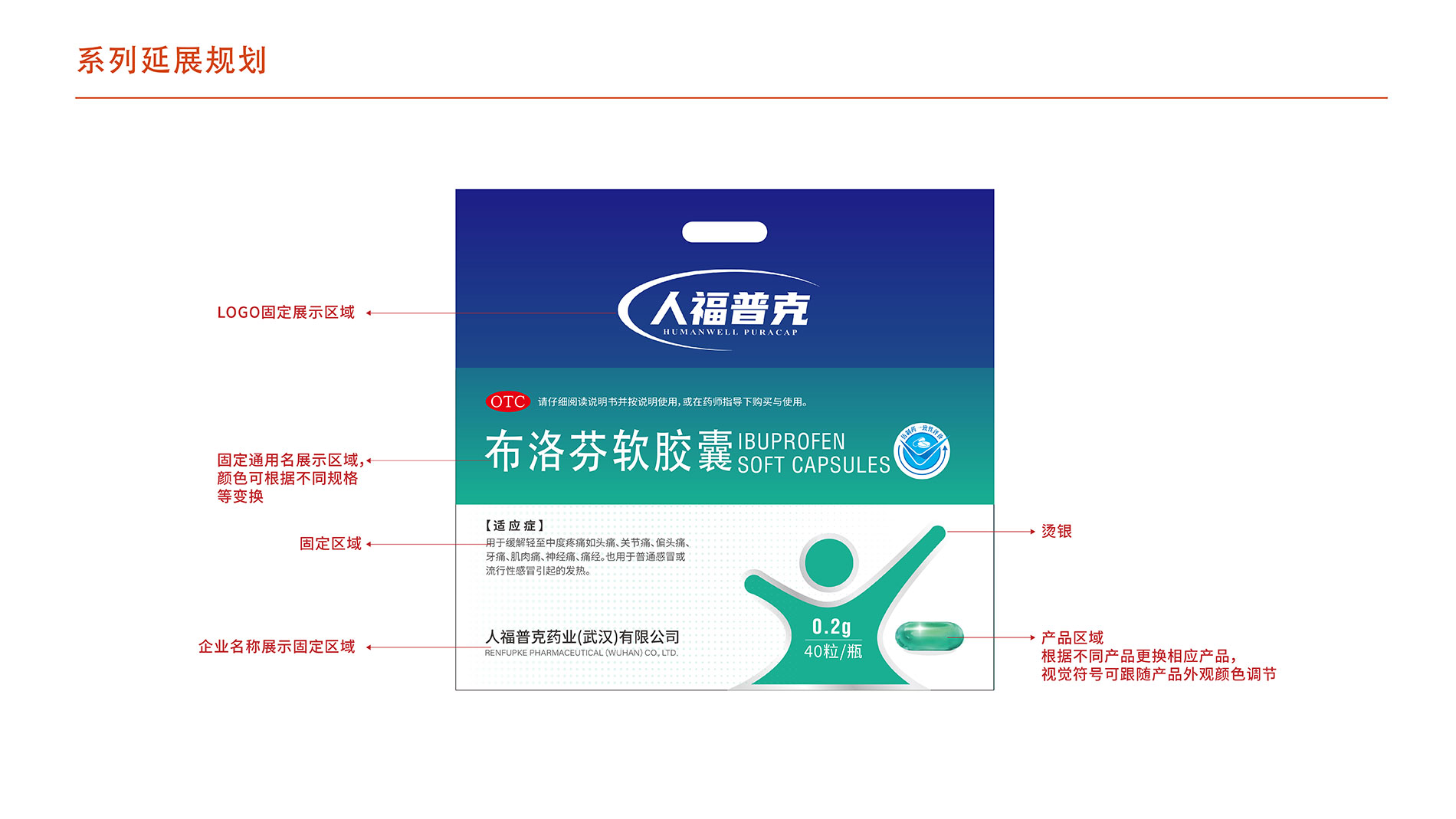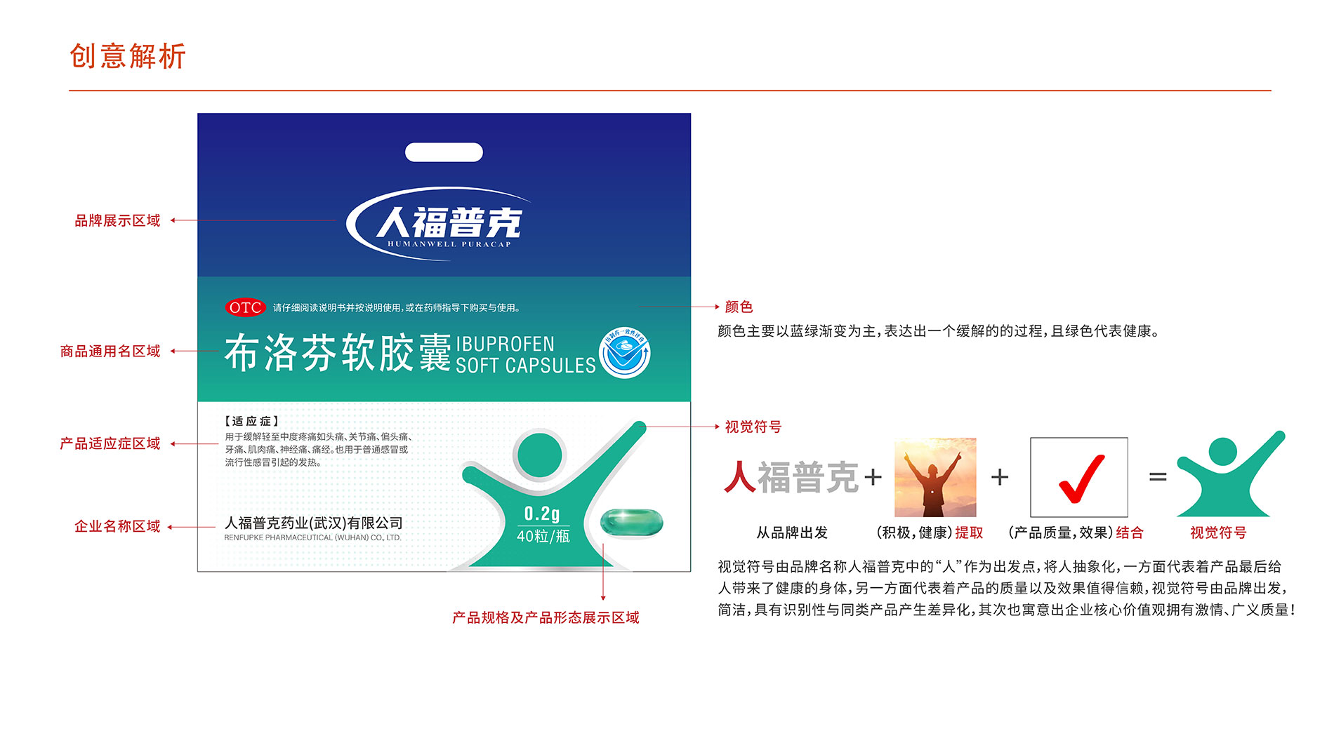 “人福普克”我們取出“人”字,并以服務的“人”為出發點。樂觀積極,健康向上是正能量精神,賦予此層含義,符號整體形式帶給人們一種正能量的情緒感染。對鉤標識喻義健康的身體,結合產品屬性,又喻產品有著值得信賴的品質和效果。由品牌出發進行設計,簡潔的視覺符號內含豐富寓意,與同類產品產生差異化,并映射出企業激情且具有廣義質量的核心價值觀。