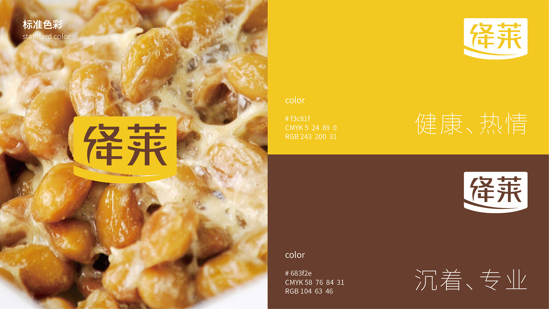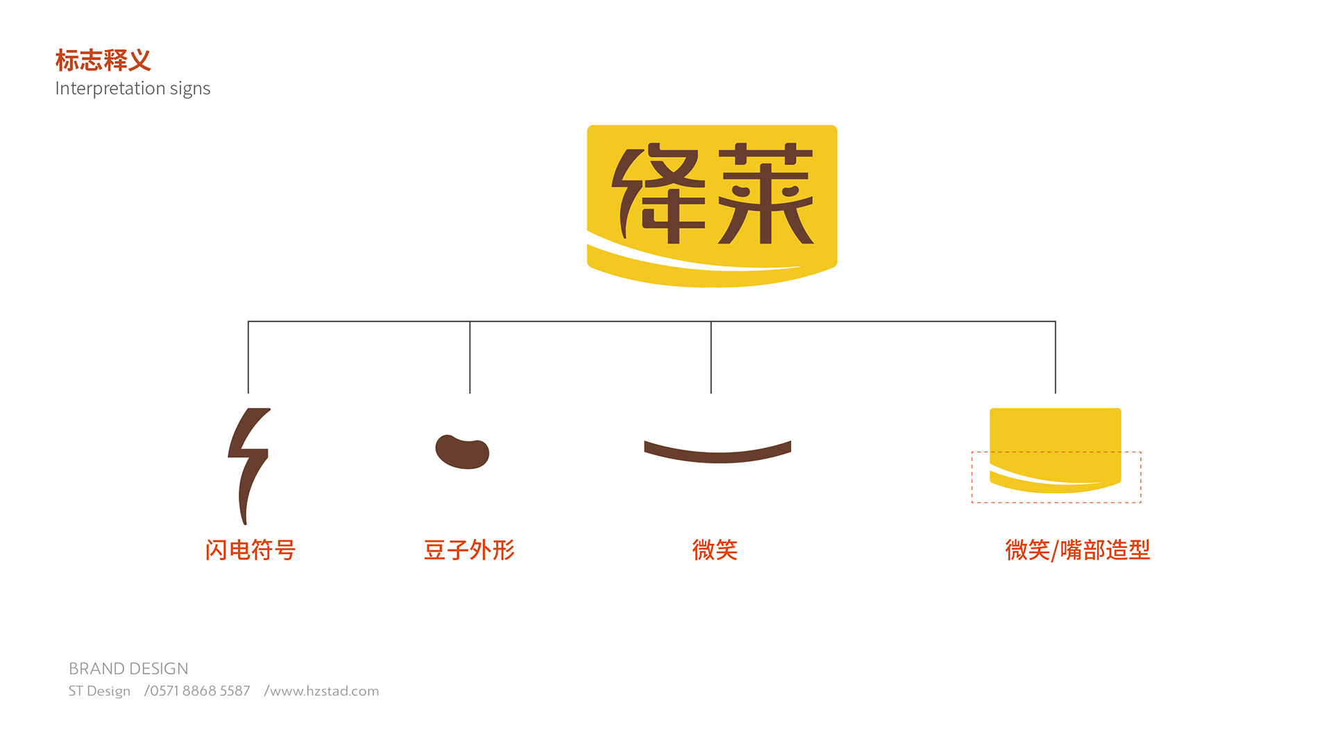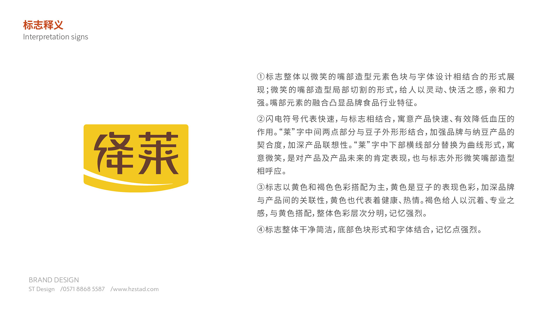 標志整體以微笑的嘴部造型元素色塊與字體設計相結合的形式展現;微笑的嘴部造型局部切割的形式,給人以靈動,快活之感,親和力強。閃電符號代表快速,與標志相結合,寓意產品快速,有效降低血壓的作用?!叭R”字中間兩點部分與豆子外形相結合,加強品牌與納豆產品的契合度,加深產品的聯想性。