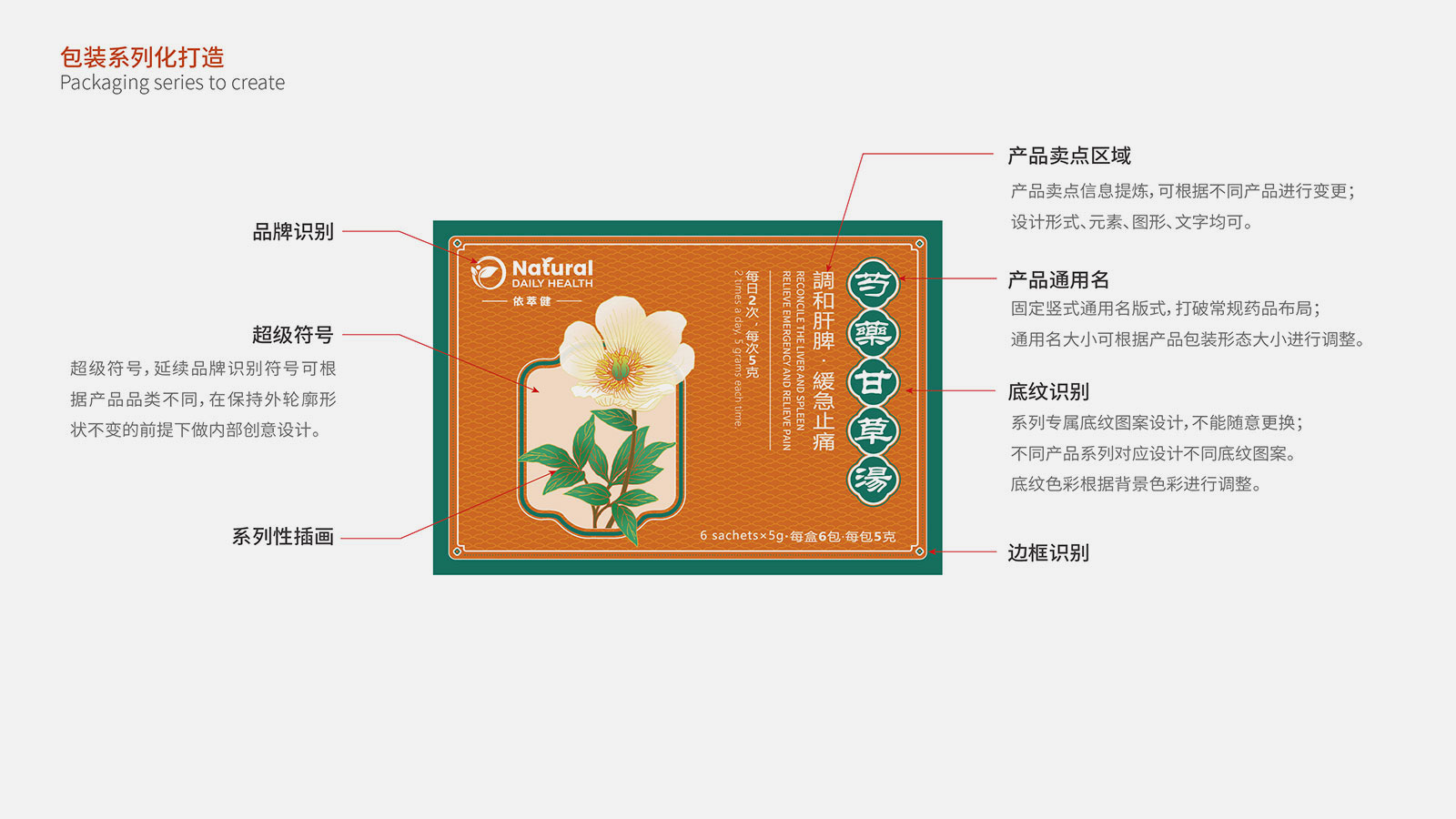 各大系列在企業品牌統一視覺基調上進行設計,強化品牌識別度。根據藥品主治功效、作用部位、受眾人群,基于藥品屬性和人視覺、心理需求,通過醒目悅目的色彩和輔助圖形創意,對藥品分門別類,提高系列識別與單品辨識度。達到科學美觀、清晰易辨的效果。