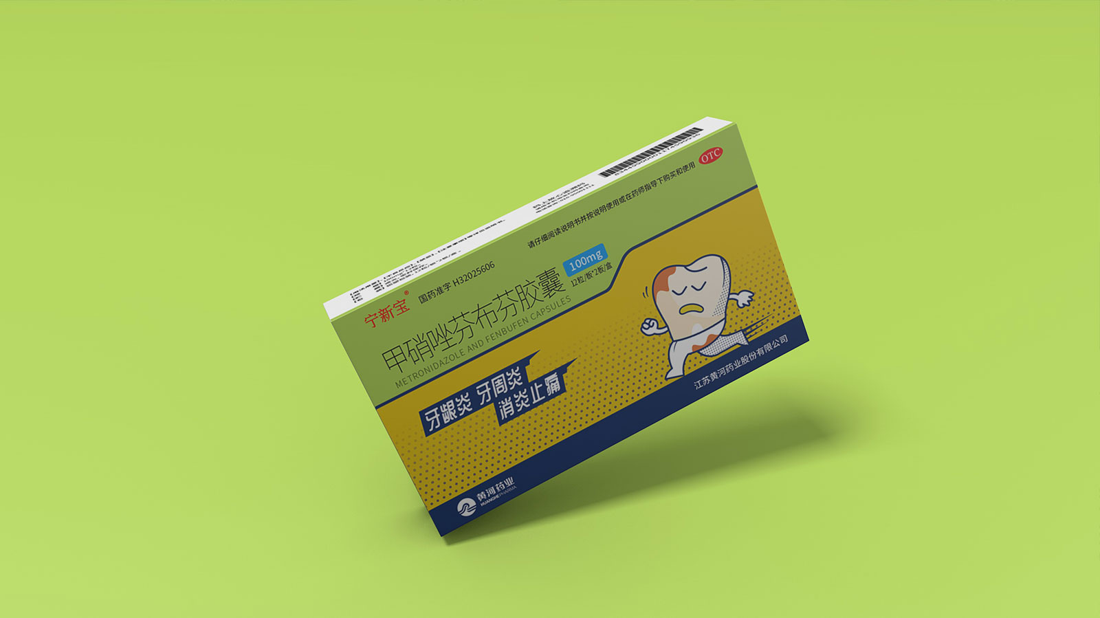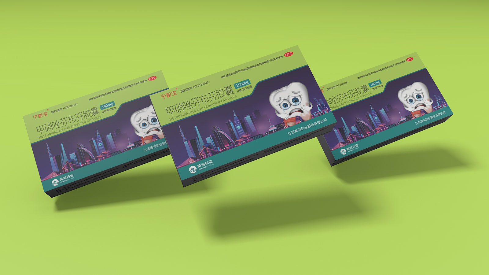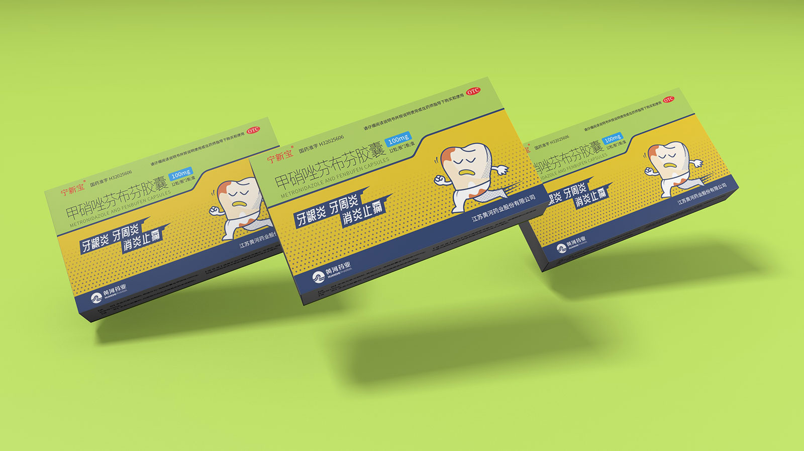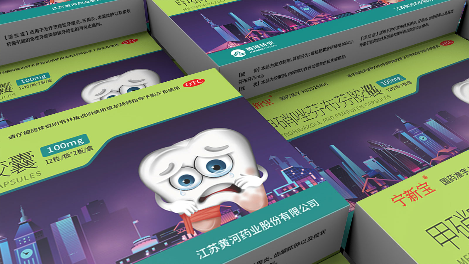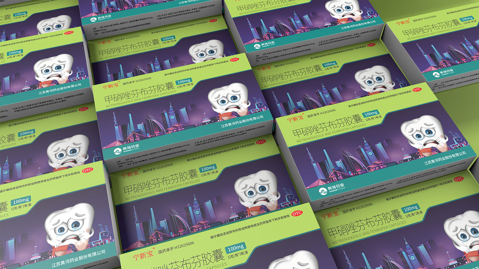 甲硝唑芬布芬膠囊包裝設計采用了插畫加IP形象的設計手法,畫面背景一邊是白天,一邊是黑夜;中間是一個以牙齒為原形的IP形象,并極度夸張掉眼淚痛苦的表情,也真實呈現了白天黑夜牙痛時的場景。畫面主體中提煉了核心受眾賣點用于:牙齦炎,牙周炎等疾患,更精準提醒夠買者行為意識。