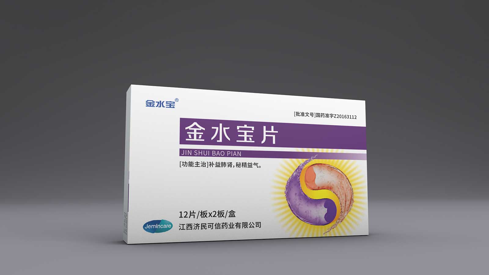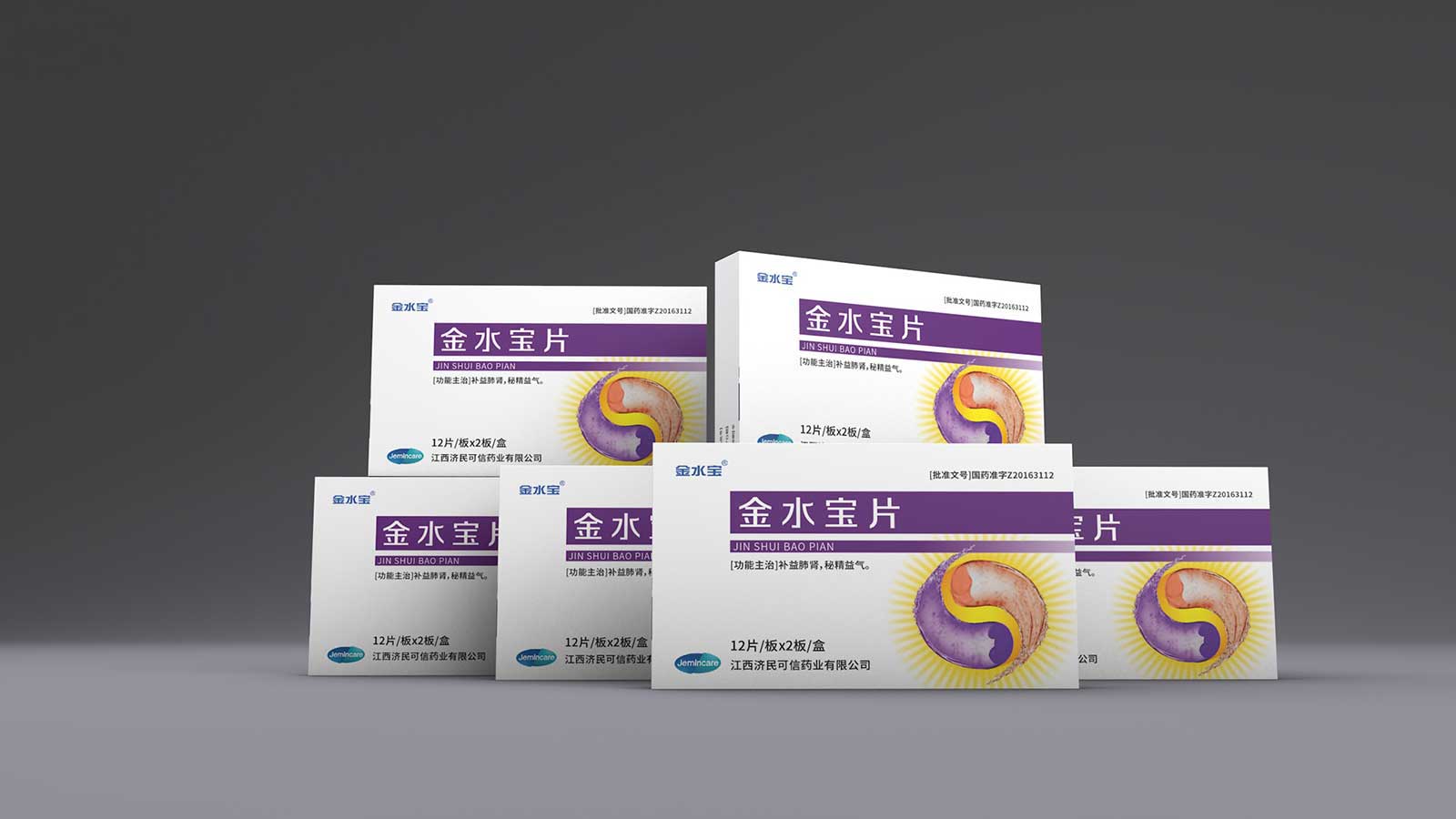 運用了太極陰陽兩儀的元素,作用于人體,表示調和、平衡,達到健康的身體狀態,符合濟民可信企業理念,跟品名五行學說的由來一脈相承;背景的太陽代表“金”,陰陽兩儀整體呈水流動狀態,寓意“水”;此外把腎和肺圖形加入進去,加以書法字體的藥效說明,闡明金水寶作用于人體哪些器官及主要功效;色調選取“腎上腺素紫”和“肺紅”,時尚吸睛又大氣穩重,符合品牌調性規范和創意表達。