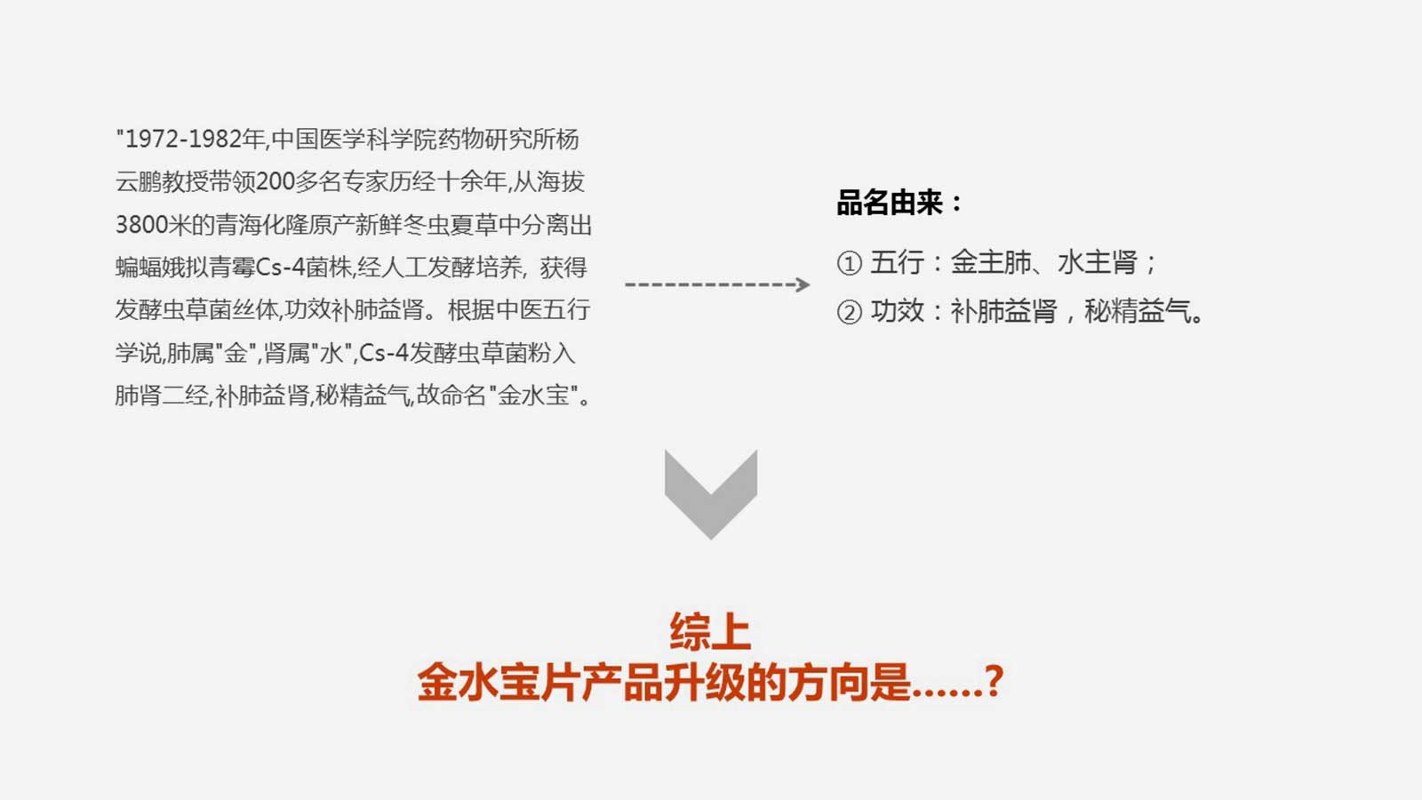 1972-1982年,中國醫學科學院藥物研究所楊云鵬教授帶領200多名專家歷經十余年,從海拔3800米的青?;≡a新鮮冬蟲夏草中分離出蝙蝠娥擬青霉Cs-4菌株,經人工發酵培養, 獲得發酵蟲草菌絲體,功效補肺益腎。根據中醫五行學說,肺屬"金",腎屬"水",Cs-4發酵蟲草菌粉入肺腎二經,補肺益腎,秘精益氣,故命名"金水寶"。
