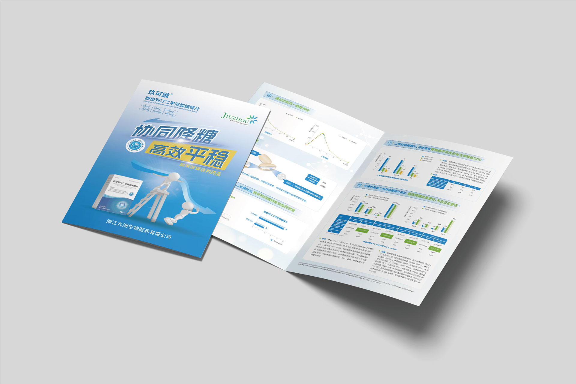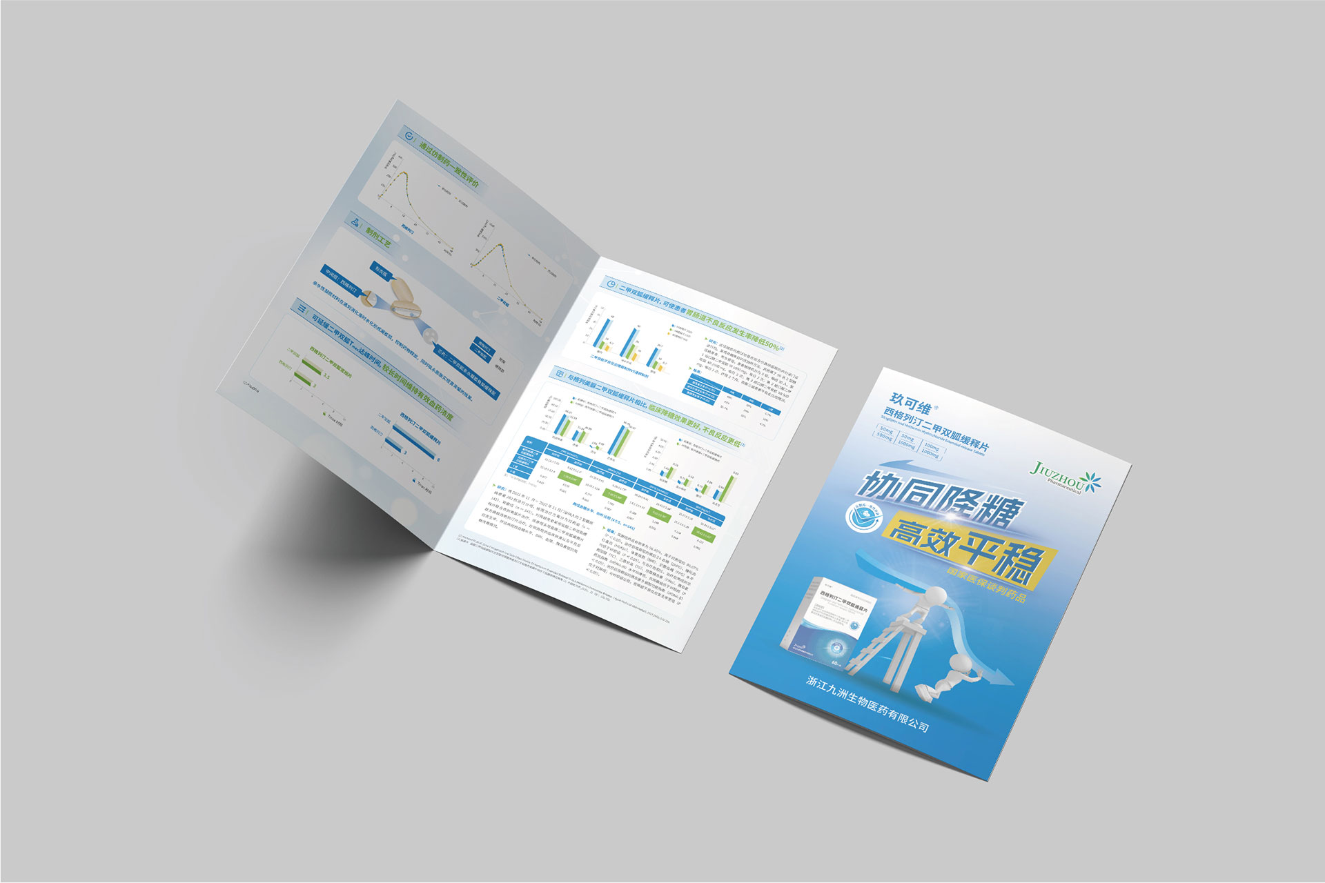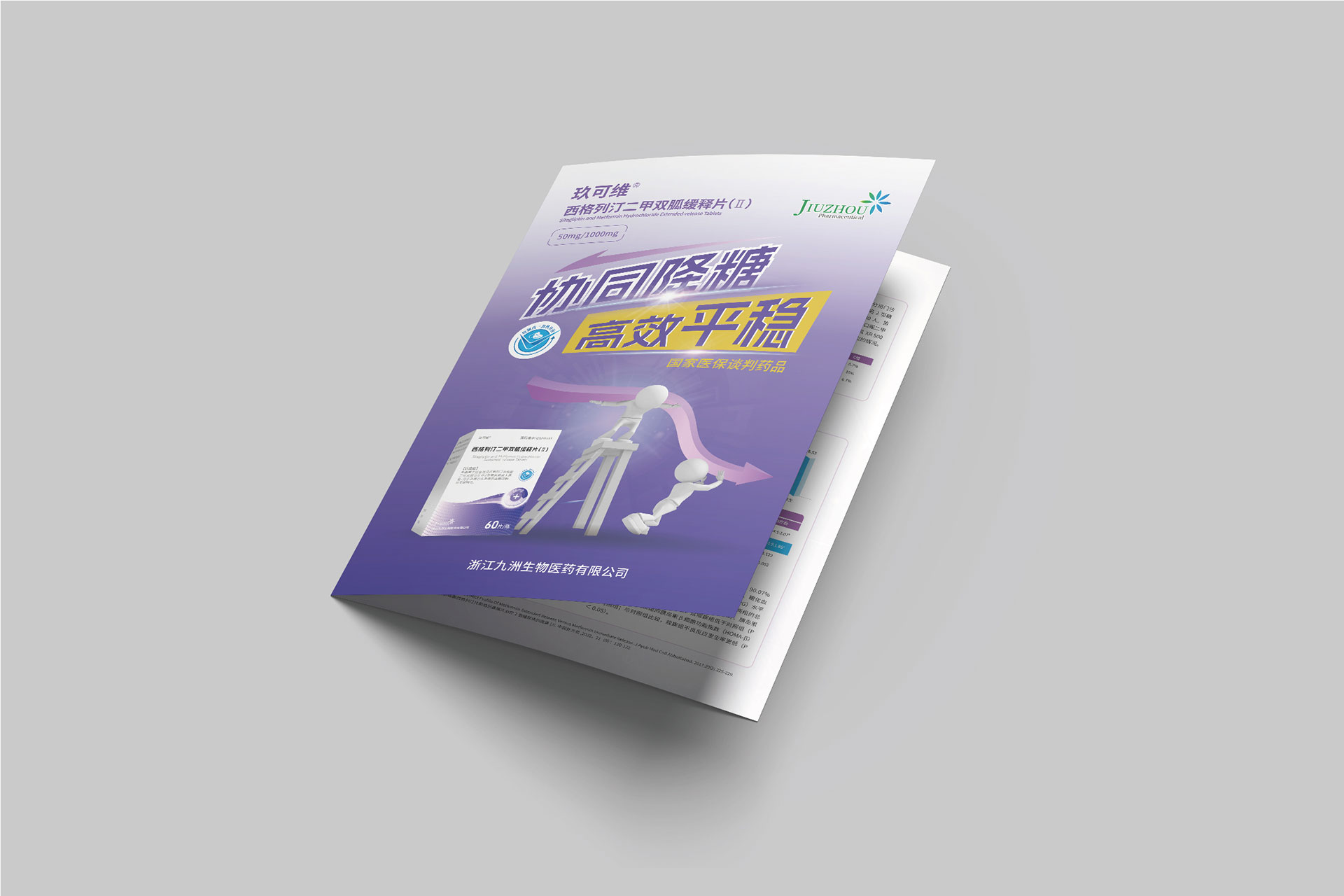浙江九洲生物醫藥有限公司(九洲藥業,股票代碼:603456.SH)是國內領先的創新藥CDMO企業,其控股子公司研發的**西格列汀二甲雙胍緩釋片(Ⅱ)**于2024年4月獲國家藥品監督管理局注冊證書,主要用于治療2型糖尿病,尤其針對二甲雙胍單藥治療血糖控制不佳或需聯合用藥的患者。該藥物結合了磷酸西格列?。―PP-4抑制劑)與二甲雙胍的雙重降糖機制,并通過緩釋技術優化藥物吸收效率,減少代謝負擔。為配合藥品上市推廣及國家藥品集采中標后的市場布局,需通過專業宣傳物料(DA宣傳折頁、易拉寶)傳遞藥品核心優勢,提升醫生、患者及渠道商的認知度。