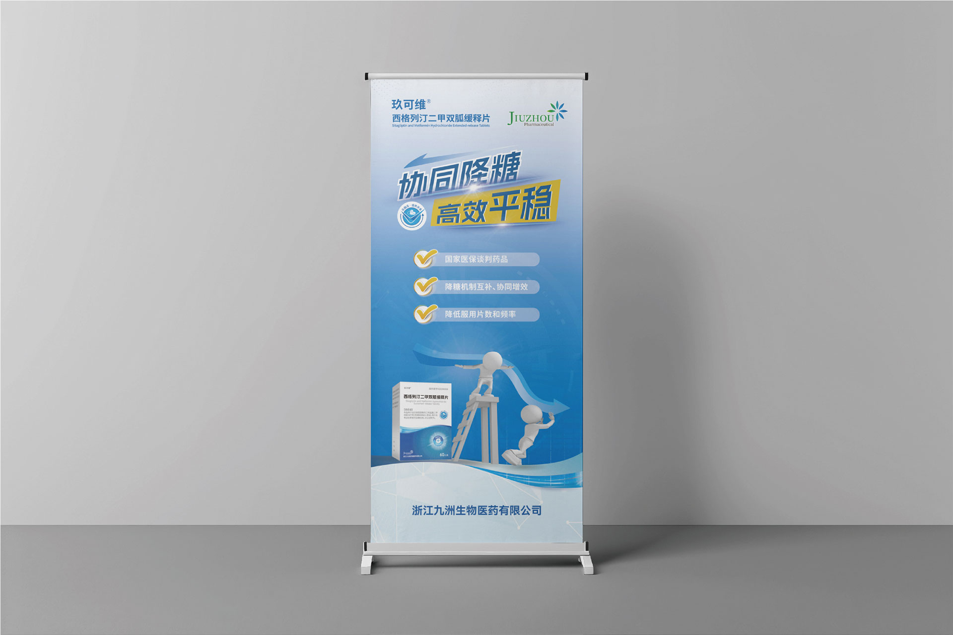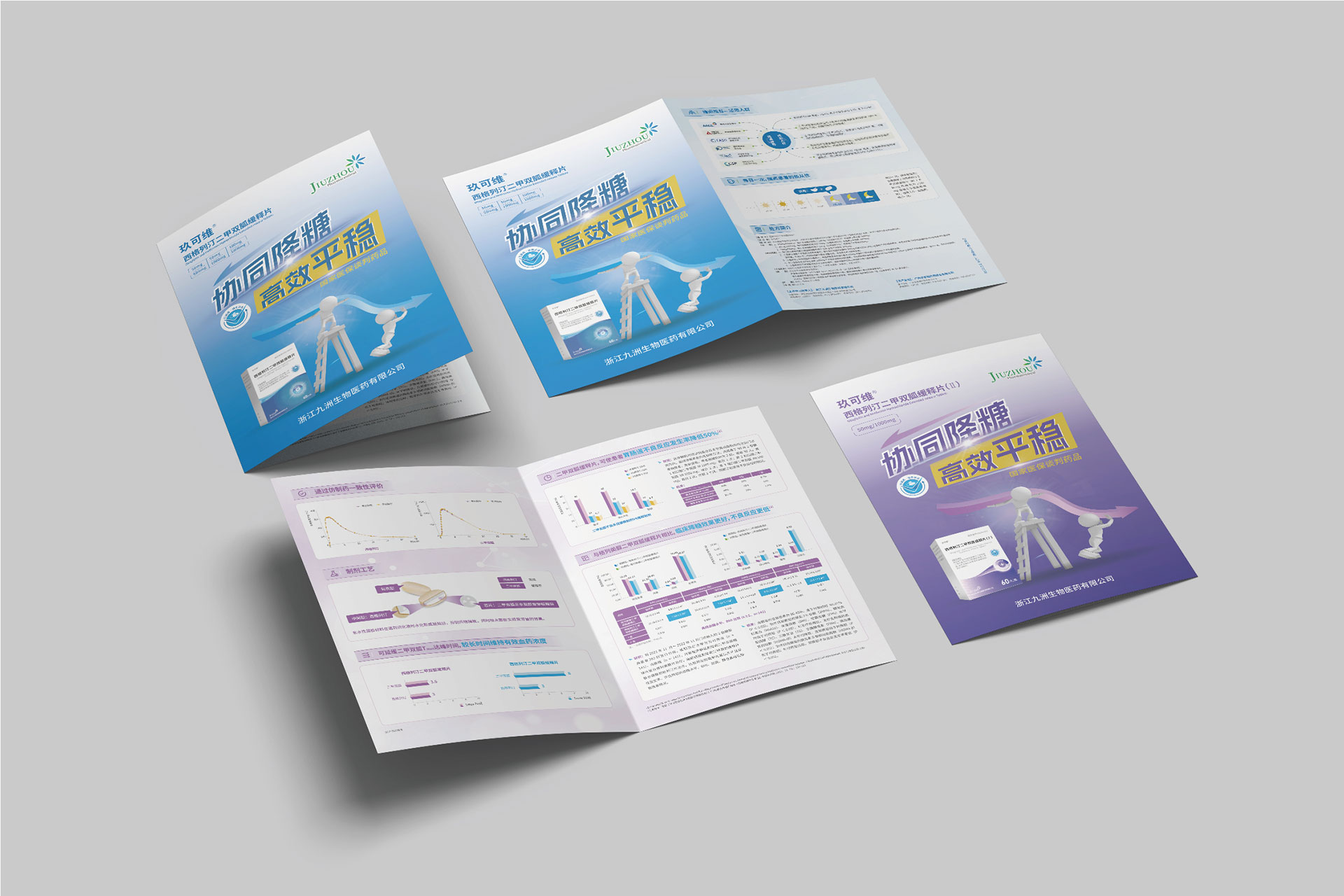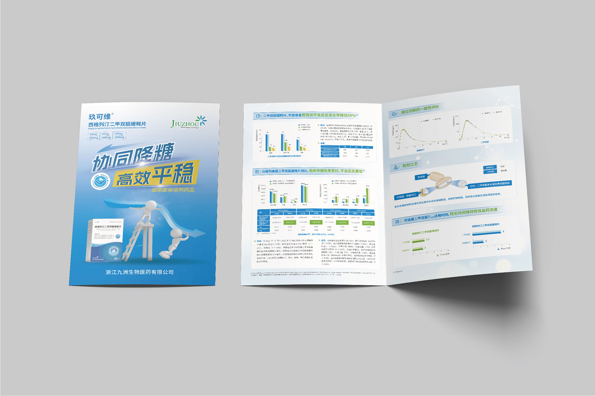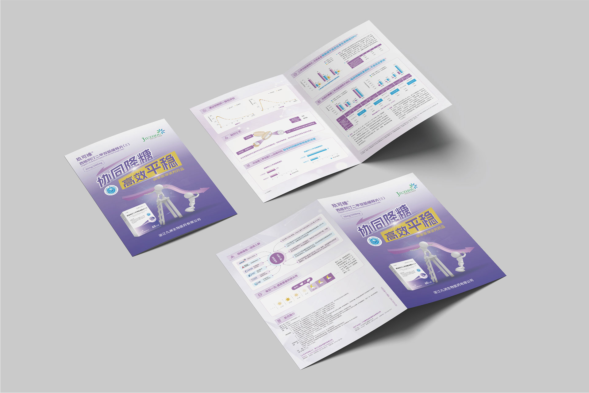 浙江九洲生物醫藥有限公司(九洲藥業,股票代碼:603456.SH)是國內領先的創新藥CDMO企業,其控股子公司研發的**西格列汀二甲雙胍緩釋片(Ⅱ)**于2024年4月獲國家藥品監督管理局注冊證書,主要用于治療2型糖尿病,尤其針對二甲雙胍單藥治療血糖控制不佳或需聯合用藥的患者。該藥物結合了磷酸西格列?。―PP-4抑制劑)與二甲雙胍的雙重降糖機制,并通過緩釋技術優化藥物吸收效率,減少代謝負擔。為配合藥品上市推廣及國家藥品集采中標后的市場布局,需通過專業宣傳物料(DA宣傳折頁、易拉寶)傳遞藥品核心優勢,提升醫生、患者及渠道商的認知度。