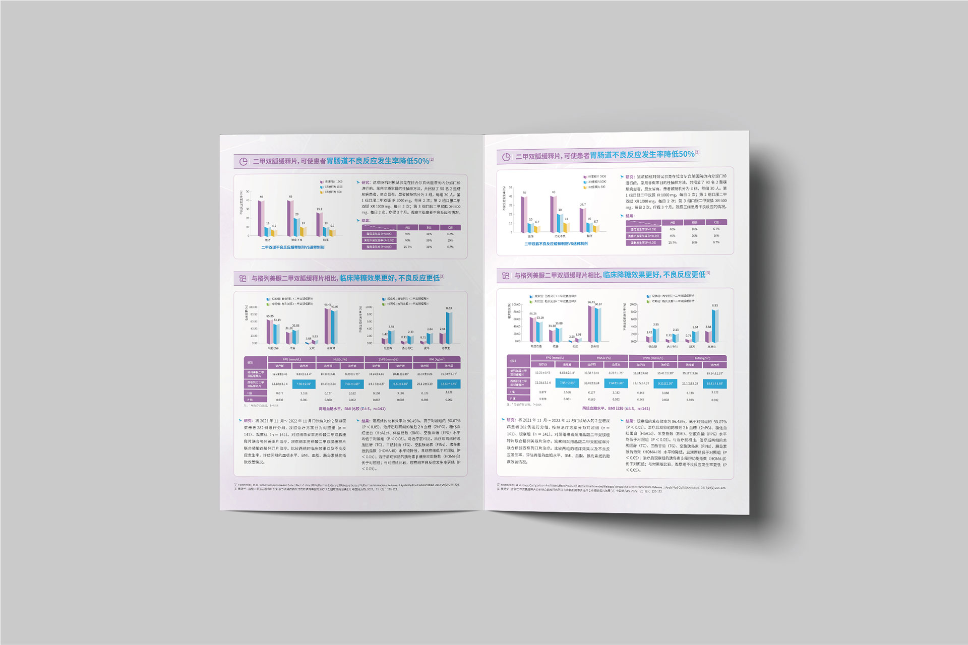折頁:封面聚焦“國家集采中標”標識與藥品名稱,內頁通過圖表對比傳統藥物與緩釋片的代謝差異,直觀展示“降糖更平穩、副作用更低”的優勢。