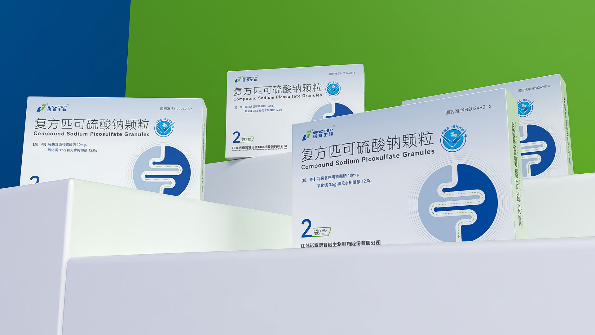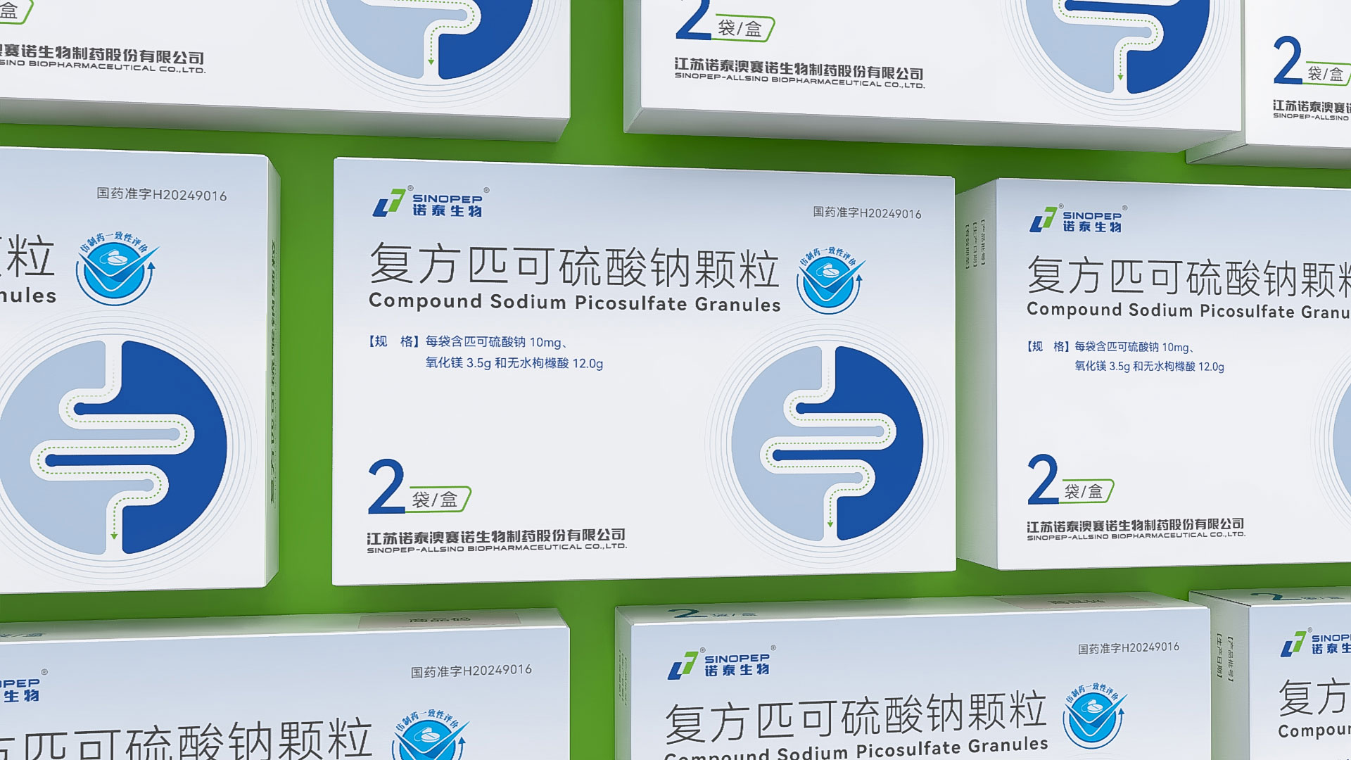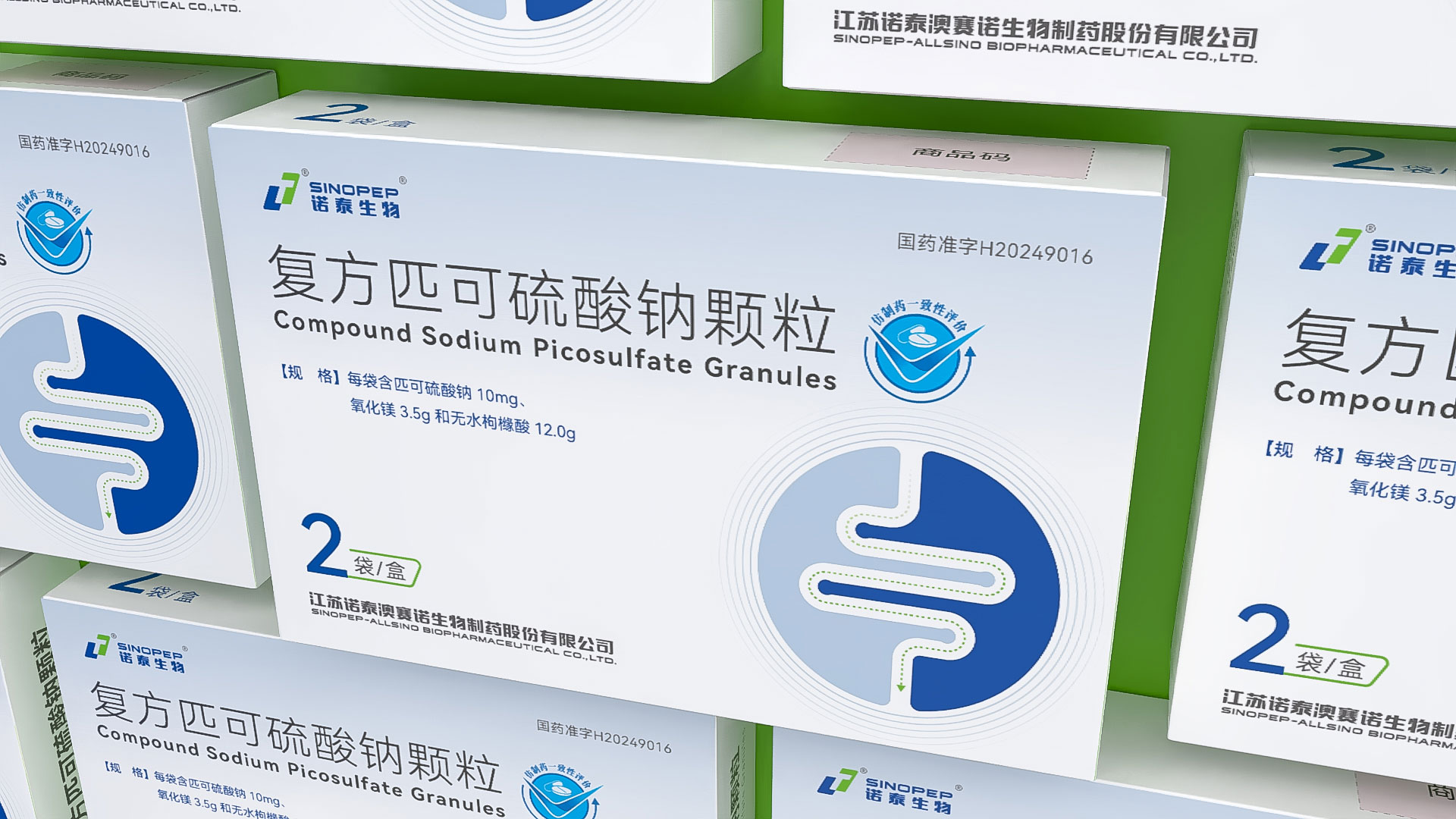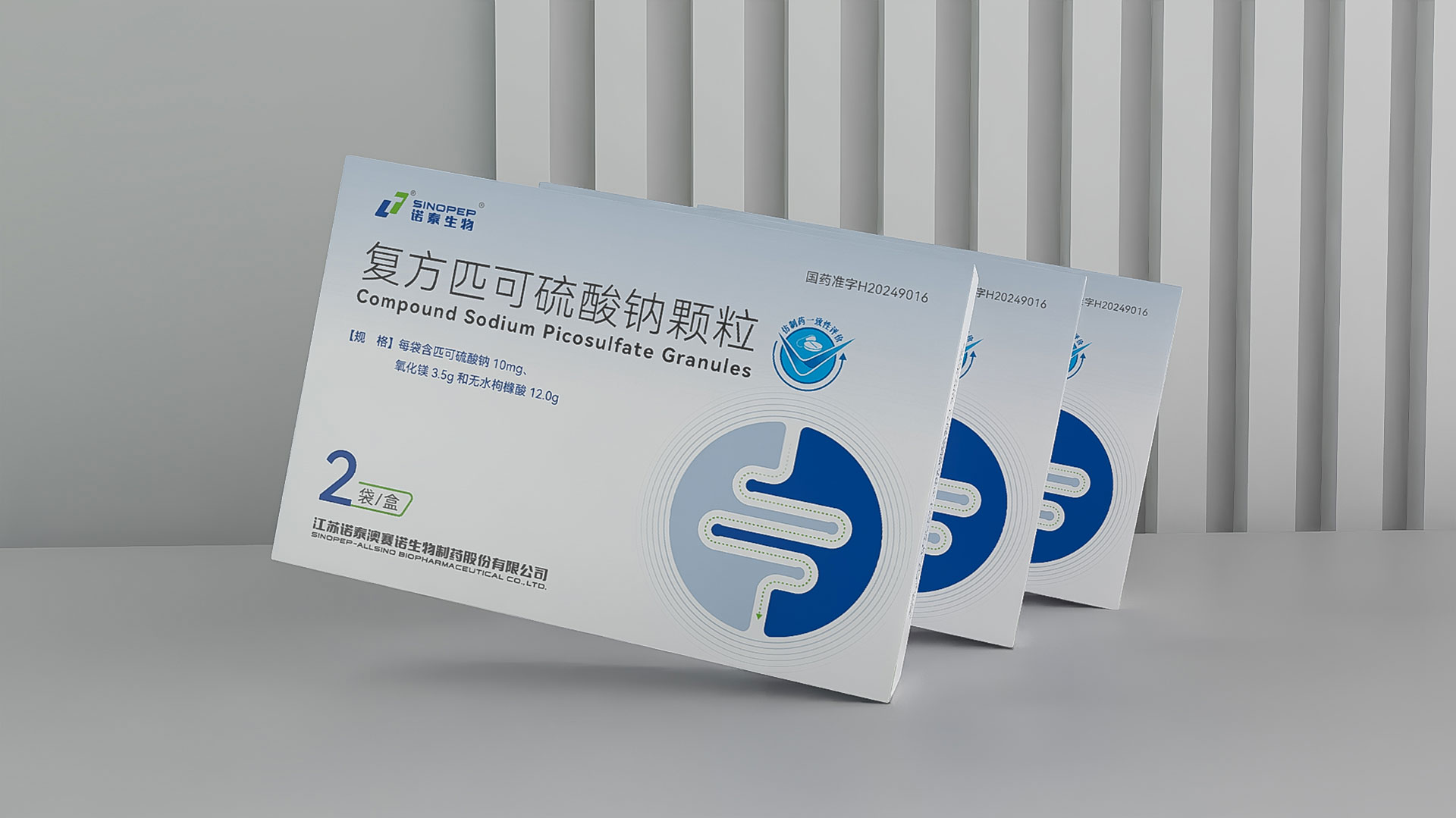 江蘇諾泰澳賽諾生物制藥股份有限公司的復方匹可硫酸鈉顆粒(規格:每袋16.1g,含匹可硫酸鈉10mg、氧化鎂3.5g、無水枸櫞酸12.0g,2袋/盒)是一款用于放射檢查、內鏡檢查或手術前腸道清潔的化學3類藥品。為提升產品市場競爭力及用戶信賴度,石特大健康團隊為其量身定制了專業化、合規化、人性化的藥品包裝設計方案,涵蓋結構設計、裝潢設計、安全防護及物流適配等多維度需求,全面滿足藥品特性、法規要求及終端用戶體驗。