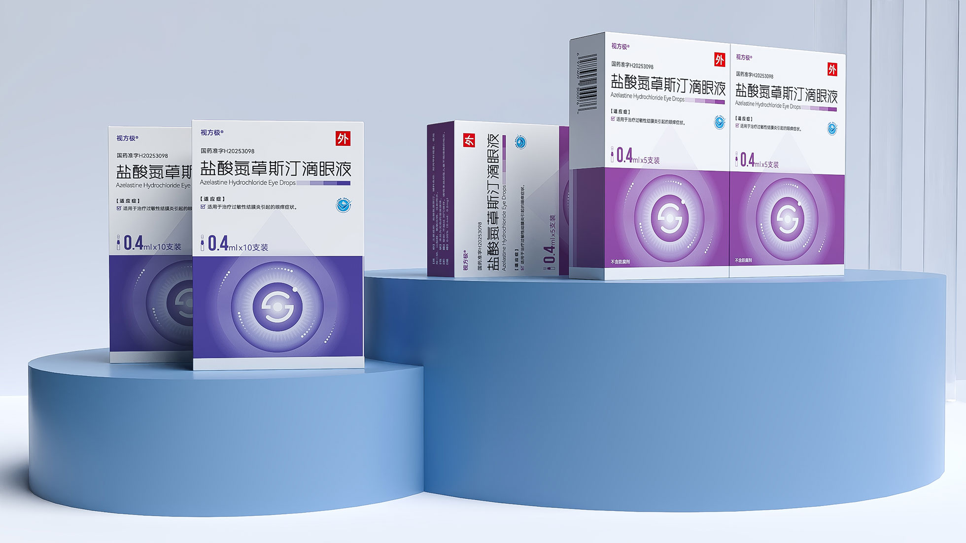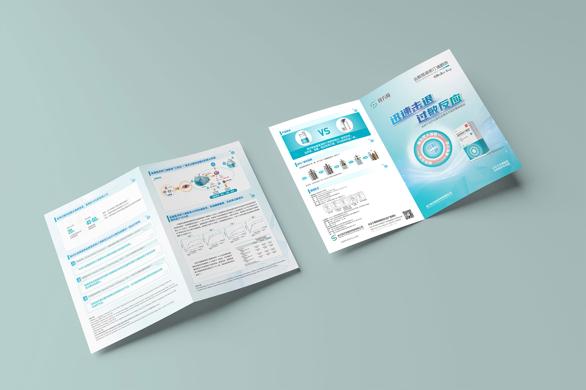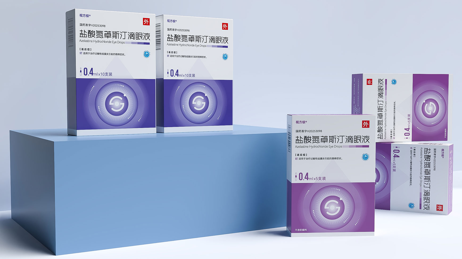 本項目是石特大健康為浙江視方極醫藥科技有限公司的核心產品——鹽酸氮?斯汀滴眼液,所提供的從終端包裝到專業DA(Detail Aid) 的一站式整合設計服務。該產品用于治療過敏性結膜炎,其市場成功既依賴于在藥店貨架上對消費者的直接吸引力,也離不開面向眼科醫生的專業學術推廣。我們的挑戰在于,如何構建一個統一的品牌視覺體系,使其在包裝上能清晰傳遞產品功效、激發購買欲望,同時在DA上能專業地呈現藥物機理和臨床優勢,成為醫生可信賴的處方依據,最終實現“藥店動銷”與“臨床推廣”的雙輪驅動。