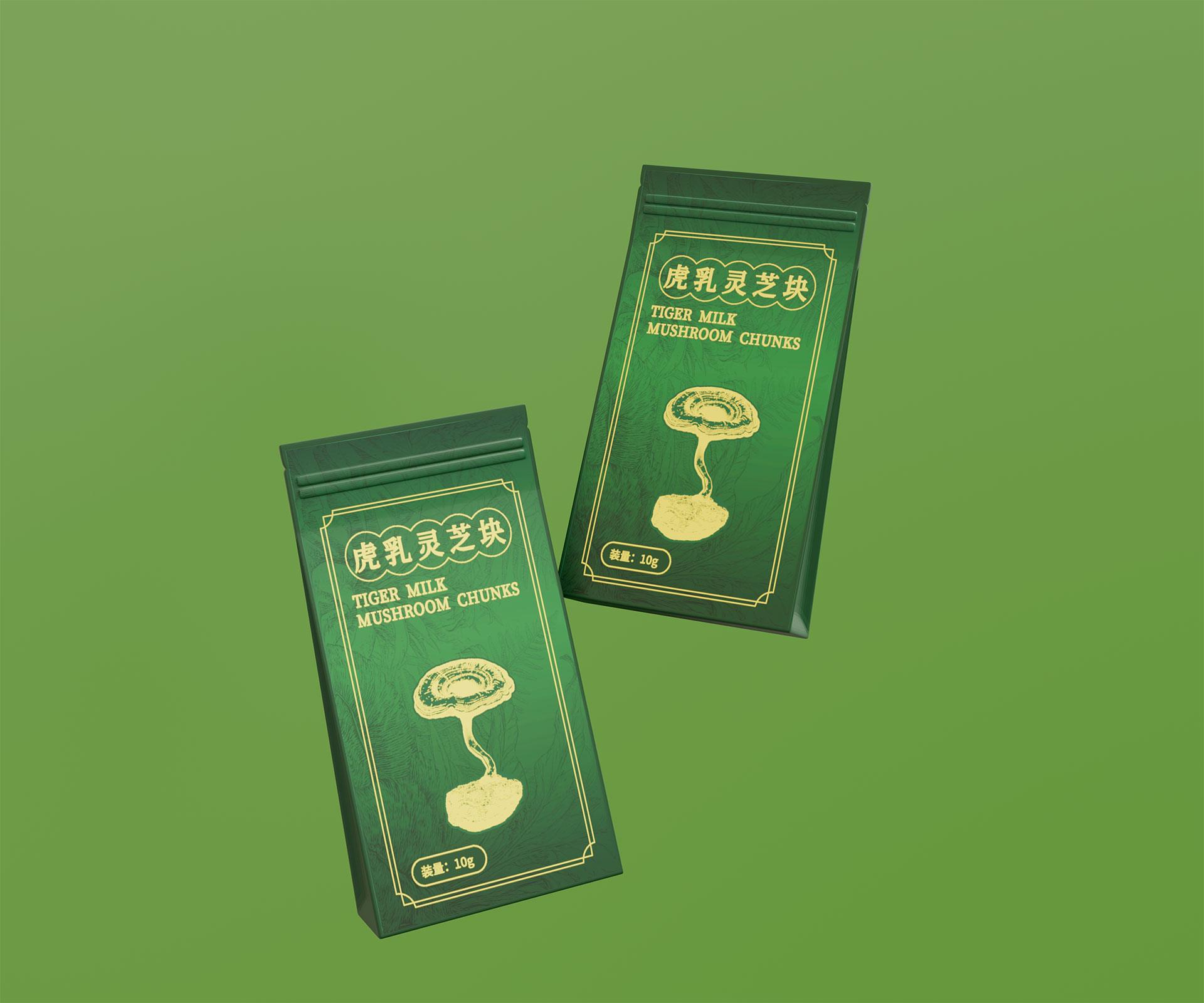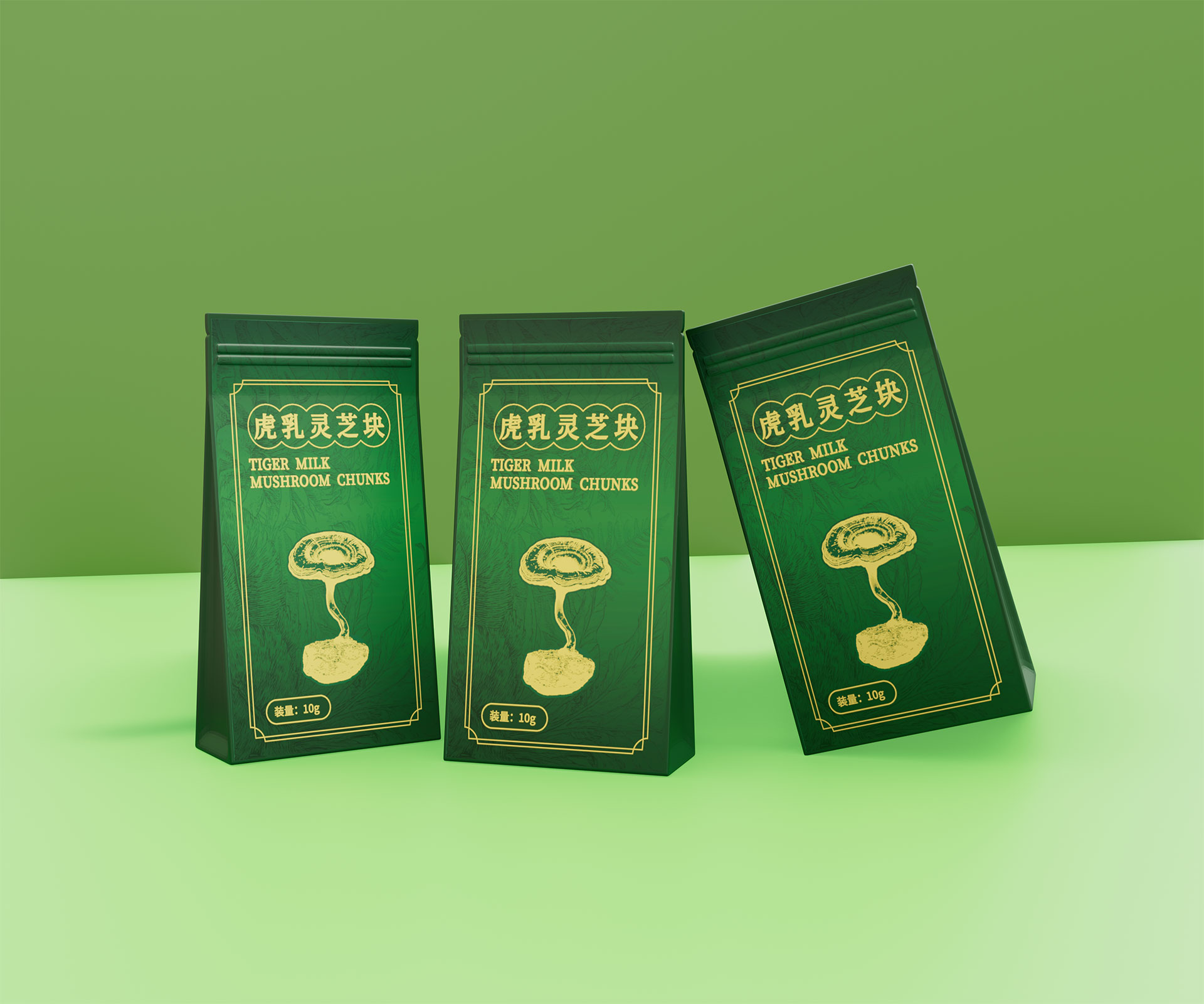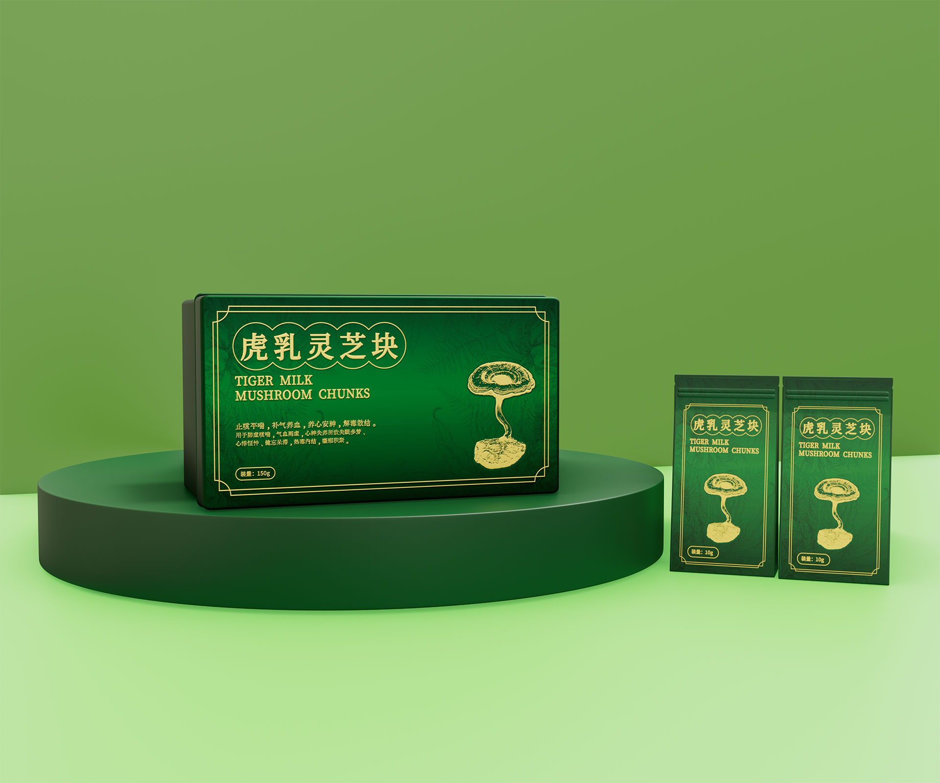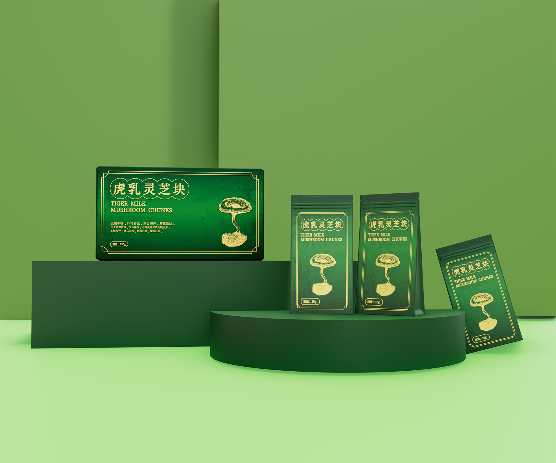 • 標志與字體系統:設計中英文組合標志。“虎乳靈芝”中文采用典雅的手寫書法字體,體現文化傳承;“TIGERMILK MUSHROOM CHUNKS”英文部分采用現代、簡約的無襯線字體,確保國際識別性。二者結合,奠定“東方底蘊,國際表達”的基調。