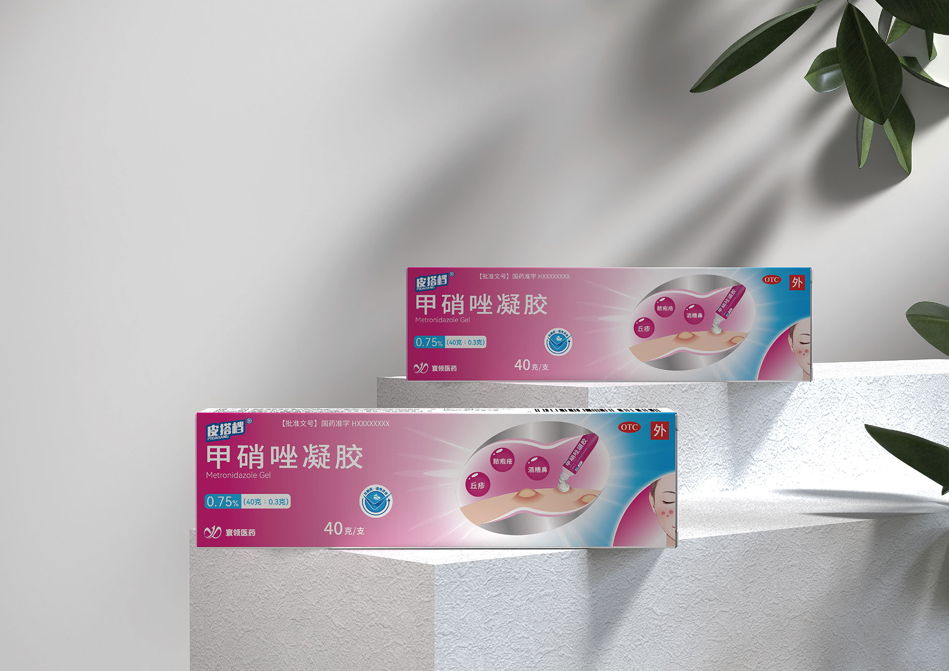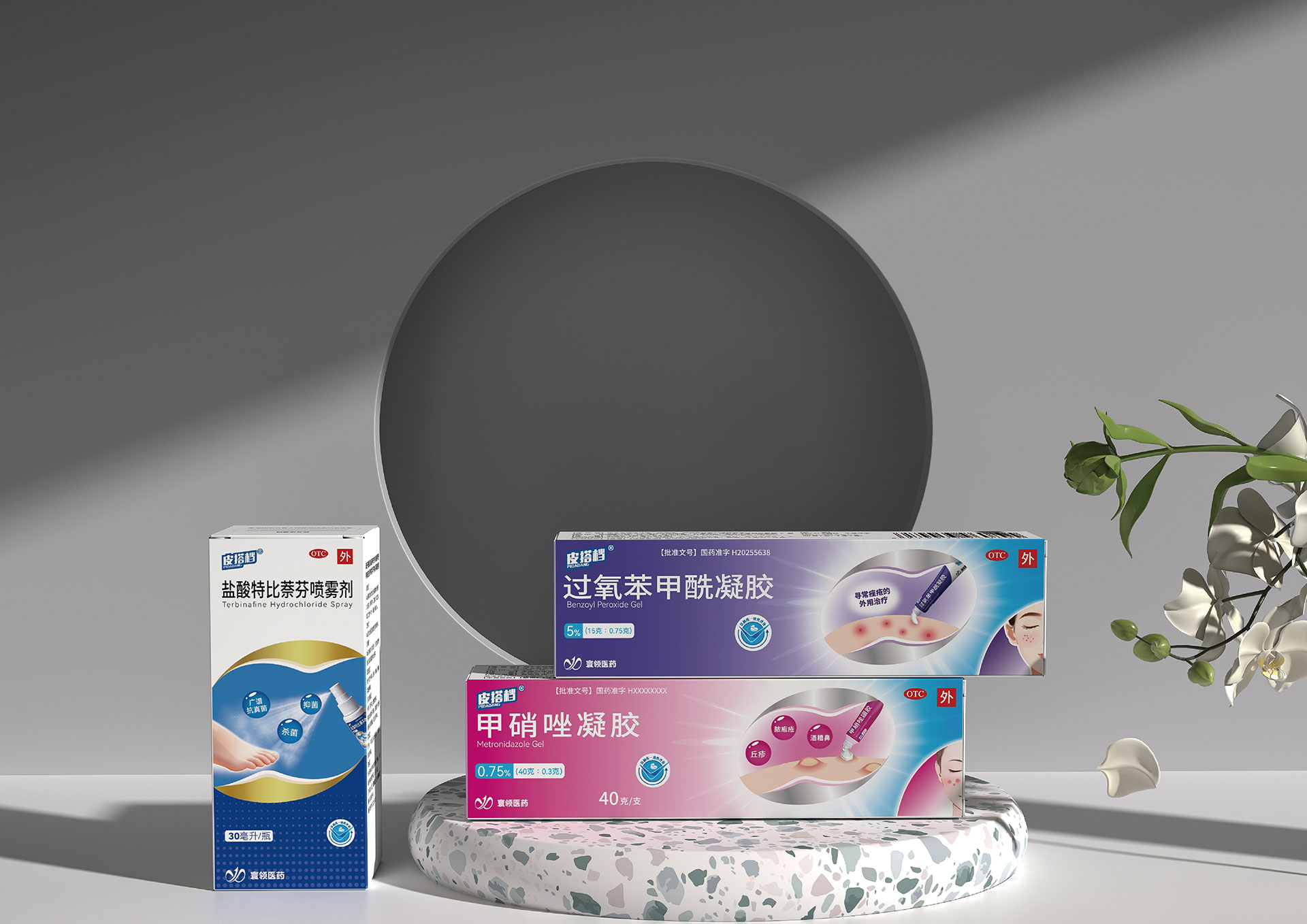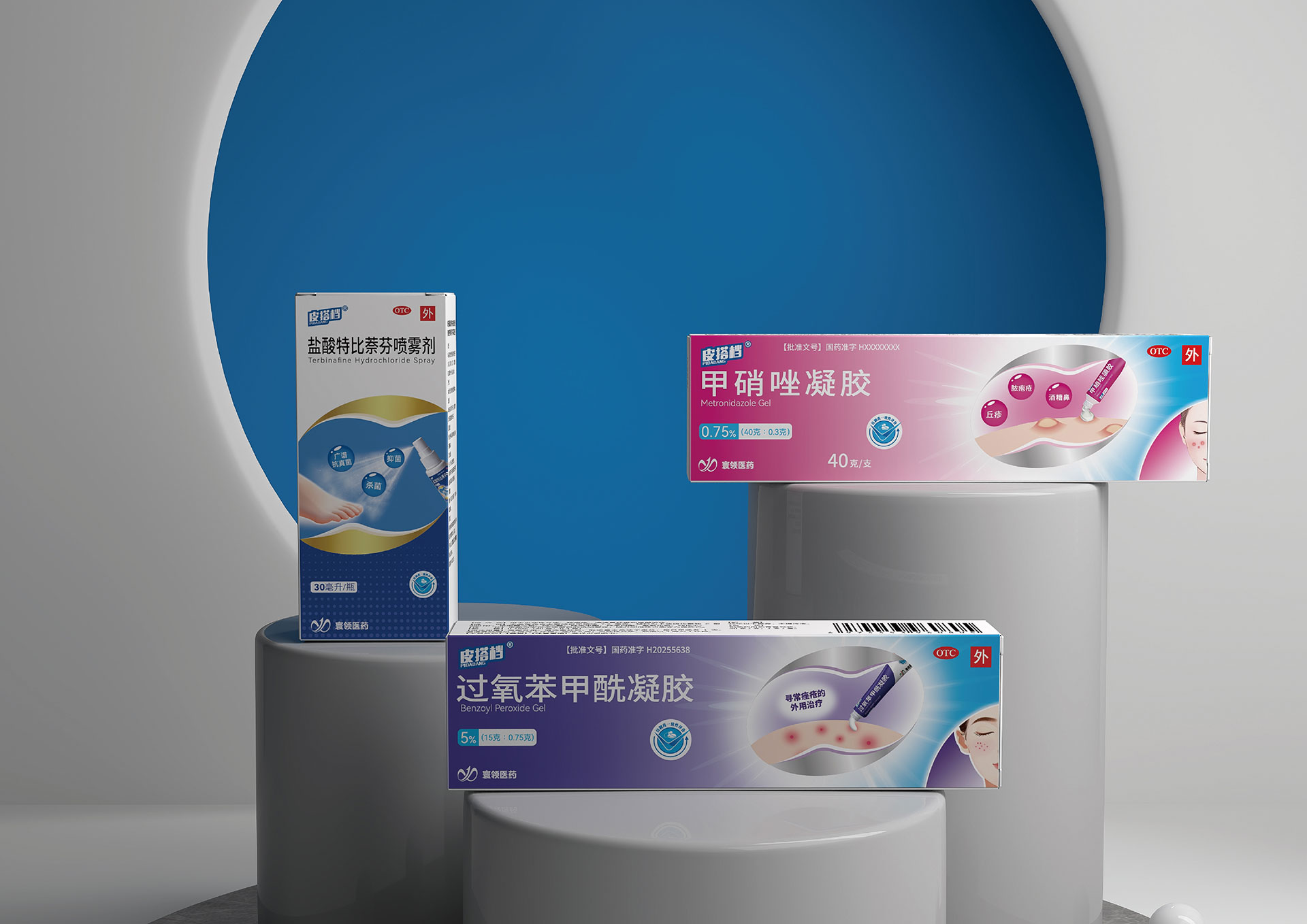 3. 功能差異化與統一性的矛盾:甲硝唑凝膠(祛痘/抗炎)、鹽酸特比萘芬噴霧劑(抗真菌)、過氧苯甲酰凝膠(祛痘/殺菌)分屬不同治療領域,包裝需在統一家族感下,清晰傳遞各自的功能差異。