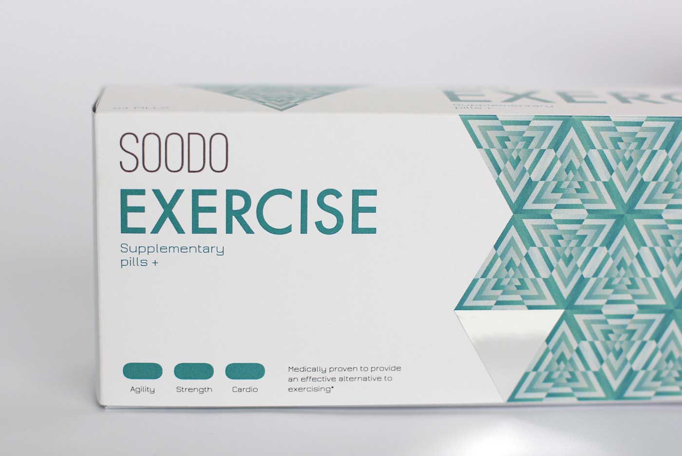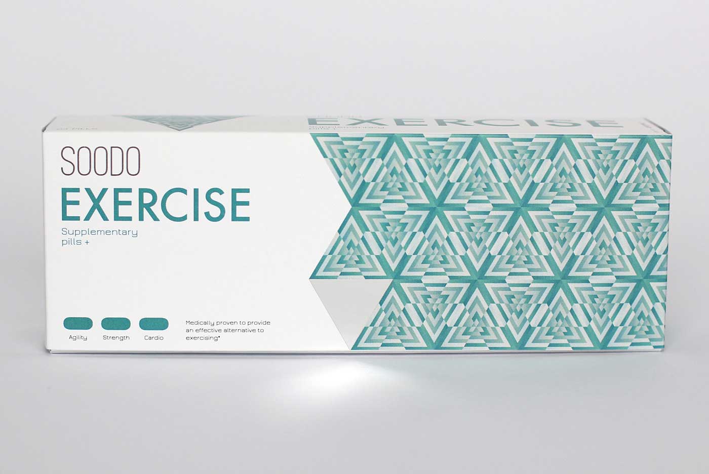 品牌名稱“SOODO”是通過將原始詞“偽”的發音,即不假的,有誤導性的。消除創造健康生活的所有自然方式的想法,導致失去與這些活動相關的重要的社會互動。我想要設計方法來反映這樣一個悲劇的后果。產品包裝采用幾何圖形進行設計,用漸變的方法使圖案更抽象化,表達補藥對人體產生的微妙變化。